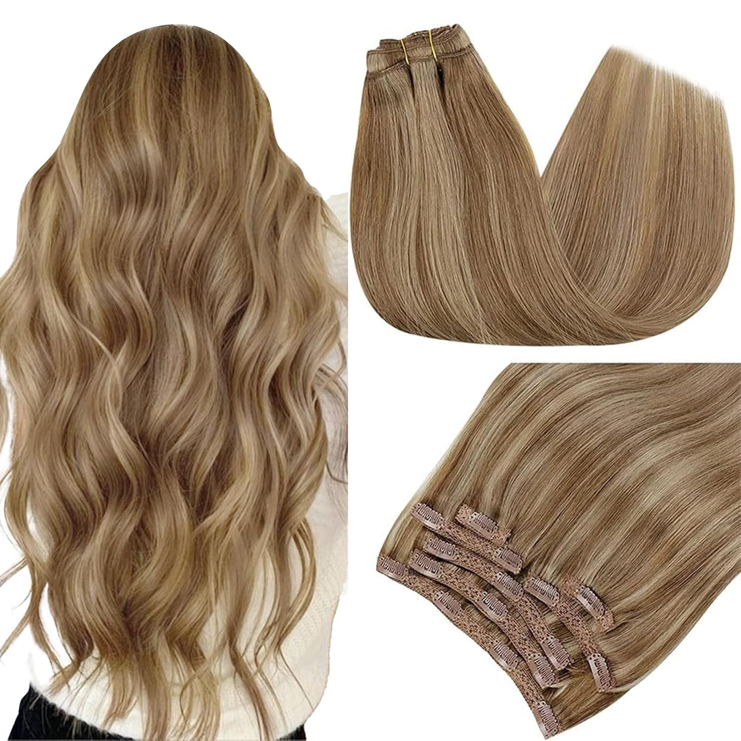 - 5.Haargewicht: 120 Gramm, normalerweise reicht 1 Packung für mehr Volumen und 2 Packungen für mehr Länge. Bitte beachten Sie, dass die Haare mit zunehmender Länge dünner werden. 120g CLIP EXTENSIONS besteht aus 105g Menschenhaar und 15g Clip