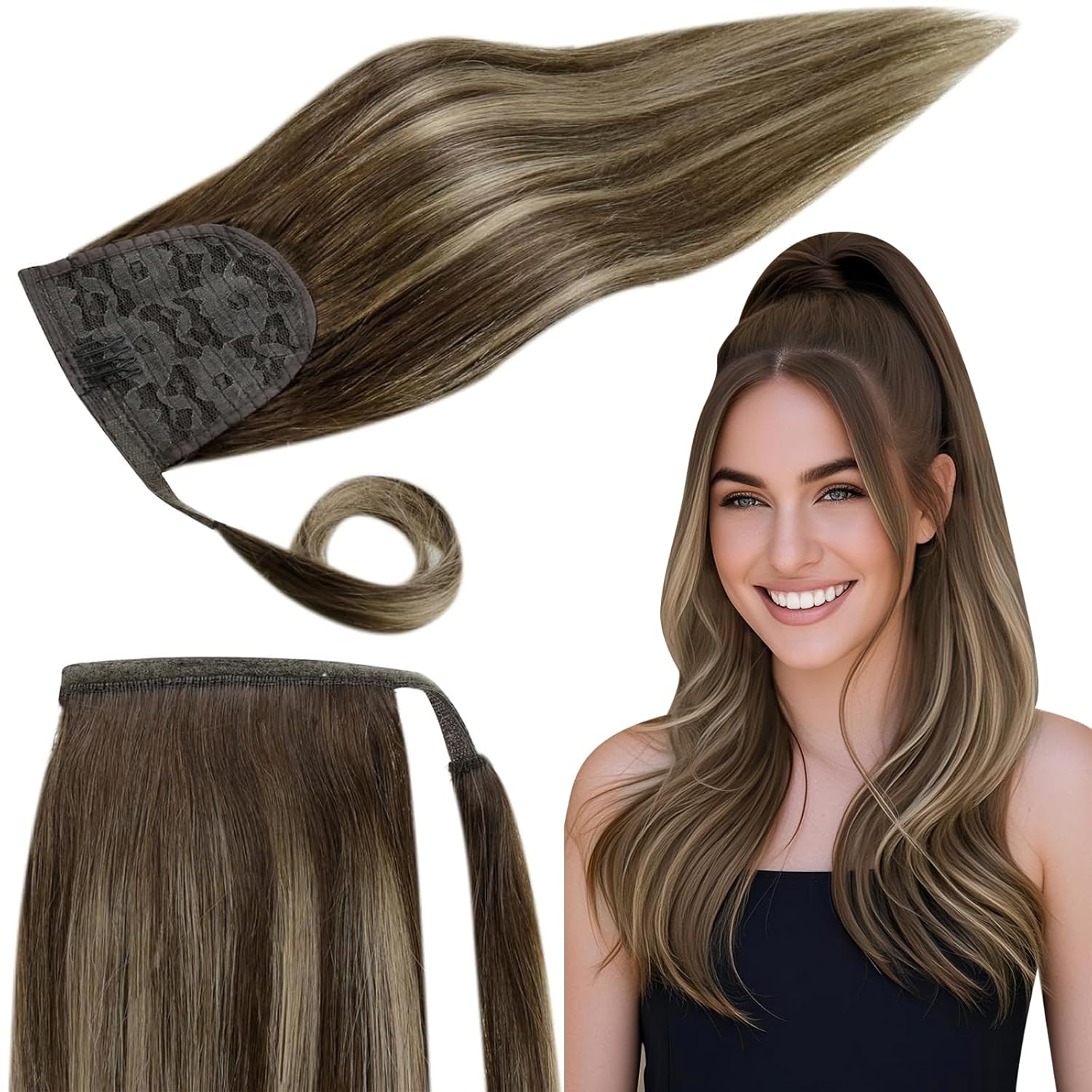 RUNATURE Extensions Echthaar Balayage Zopf Braun Blond 50cm 80g Lang Pferdeschwanz Ponytail Extensio