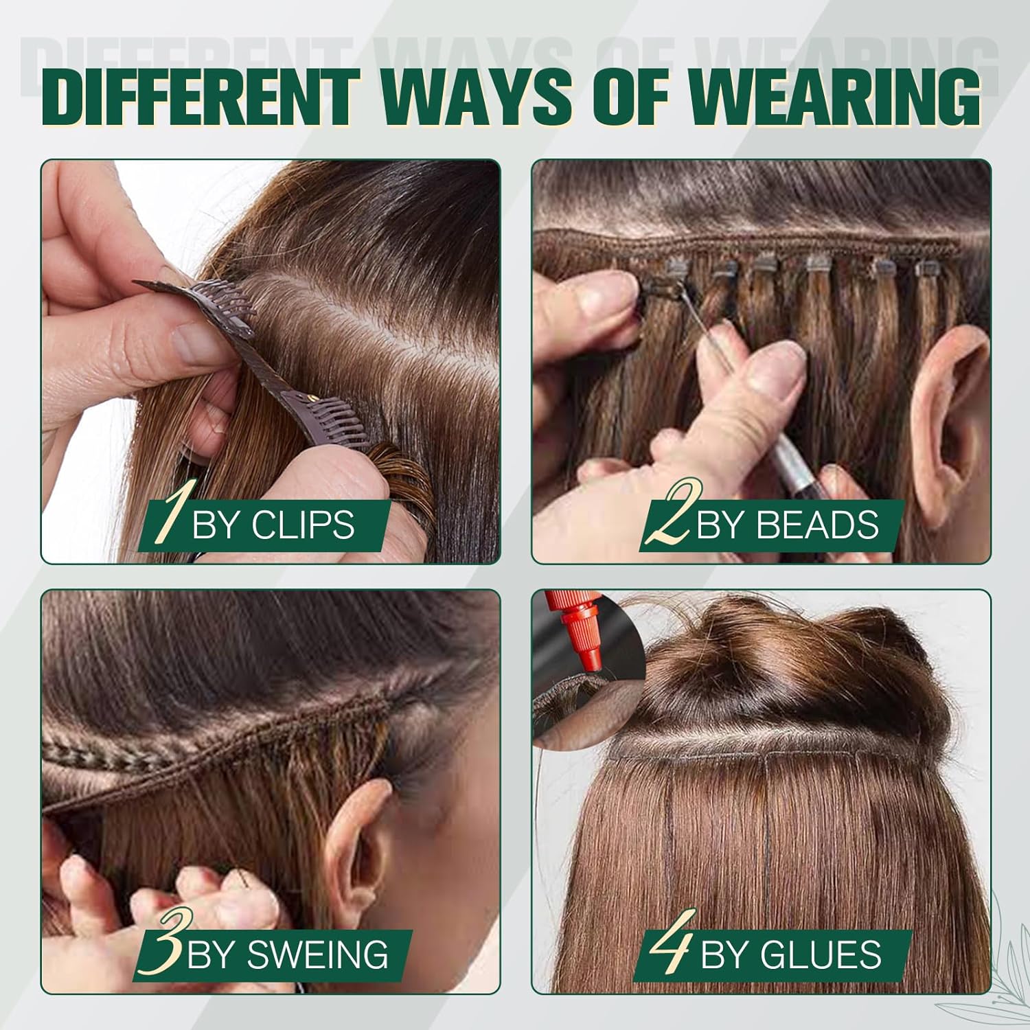 - Ergänzung zu anderen Arten von Haarverlängerungen verwendet werden, um dem Haar Volumen zu verleihen. Es kann mit Clips, Kleber, Perlen befestigt oder direkt an Ihr Haar genäht werden. (Bitte beachten Sie, dass die Clips oder Tapes oder Perlen nicht