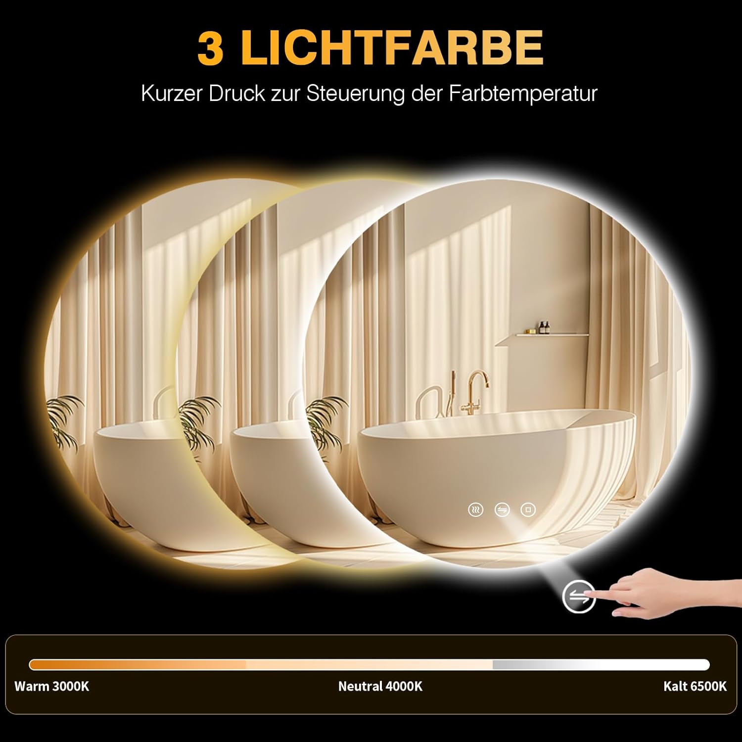 - 3 Lichtfarben und Dimmbare : Dieser Badezimmerspiegel mit Beleuchtung bietet 3 einstellbare Lichtfarben (3000K - warmweiss, 4000K - neutralweiss, 6500K - kaltweiss). Sie können Ihre bevorzugte Lichtfarbe durch kurzes Drücken der Taste einstellen. Die