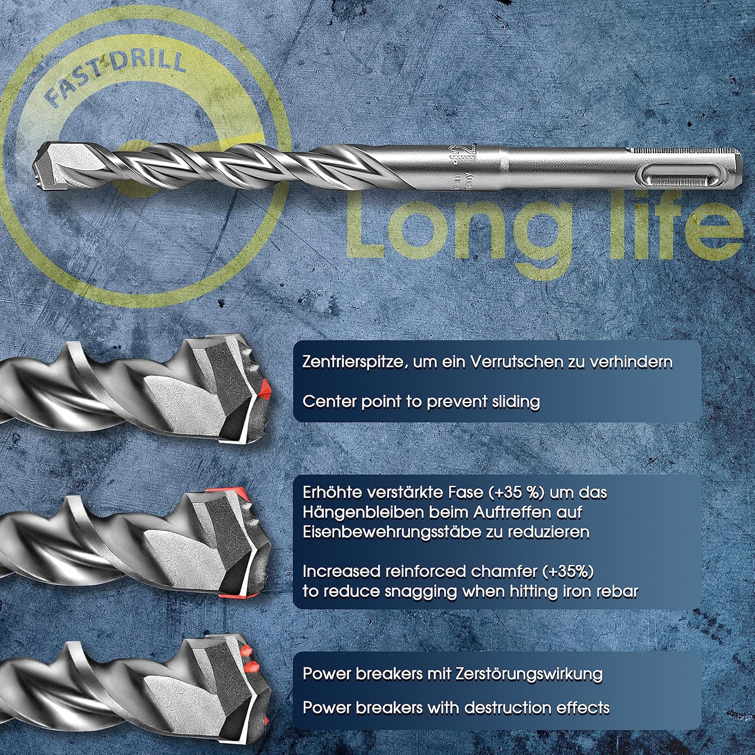 - Langlebiger Werkzeugstahl: Das Set aus hochwertigem Werkzeugstahl ist widerstandsfähig und ermöglicht langes Bohren auch unter härtesten Bedingungen, wie bei Beton-Schlagbohrern.
