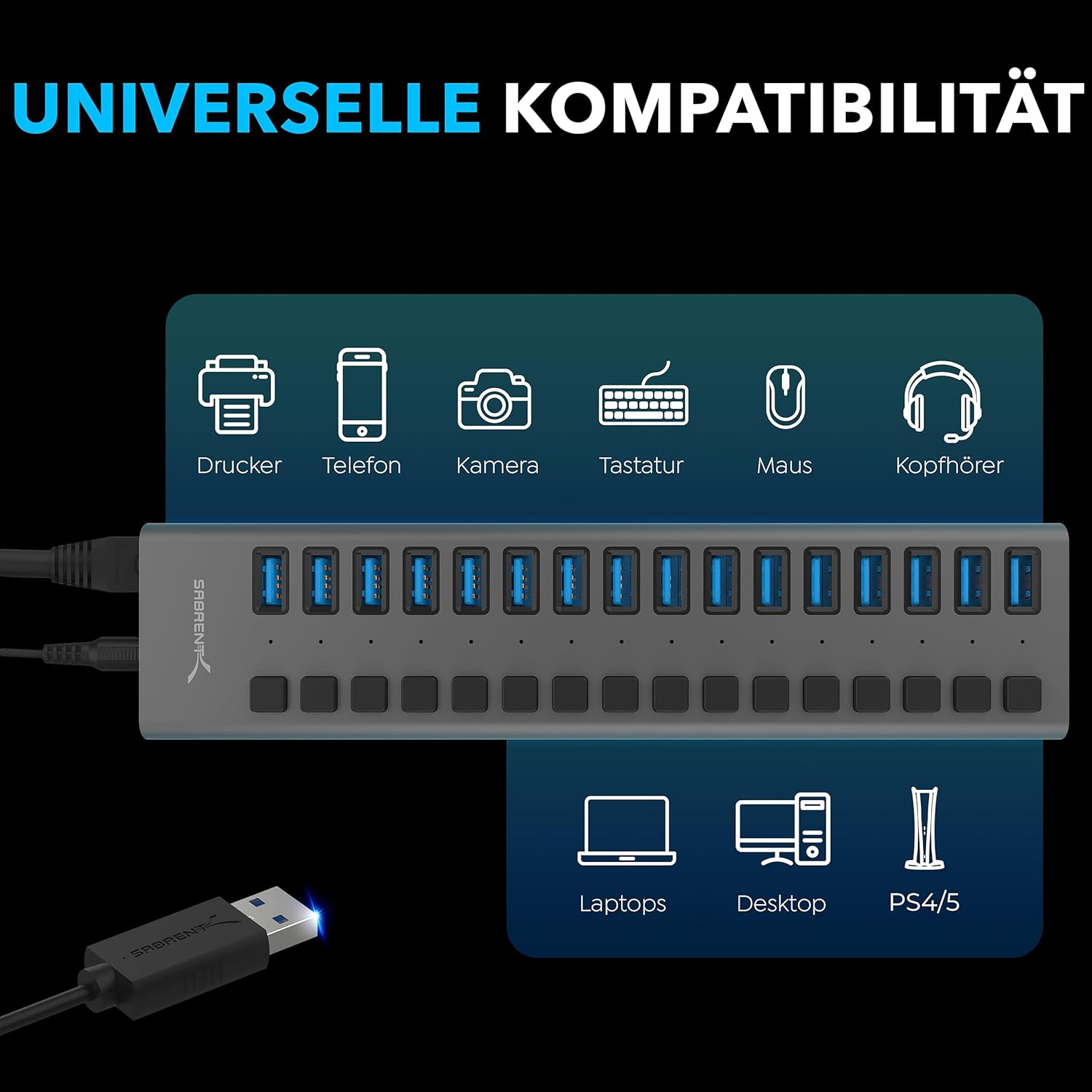 - SUPPER SPEED Übertragung: Sabrent USB HUB 16 Port, (SuperSpeed-Datenübertragung) Mit Datengeschwindigkeit von bis zu 5 Gbps 10 x schneller als USB 2.0 Damit lassen sich HD Filme, Music und data in nur Sekunden transferieren. und USB Ladegerät 90W Schnellladegerät für mehrere Geräte, lädt 10 mal so schnell wie herkömmliche Ladegeräte