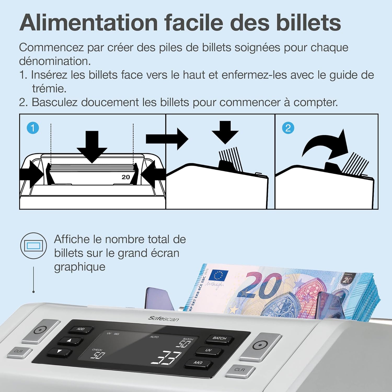 - KOMFORTABLE FÄLSCHUNGSERKENNUNG: Prüfen Sie Ihr Bargeld immer mit dem Safescan 2250. Innerhalb von Sekunden scannt er Ihre Banknoten auf bis zu drei Sicherheitsmerkmale, darunter ultraviolette Tinte, magnetische Tinte und Grösse. Wann immer der