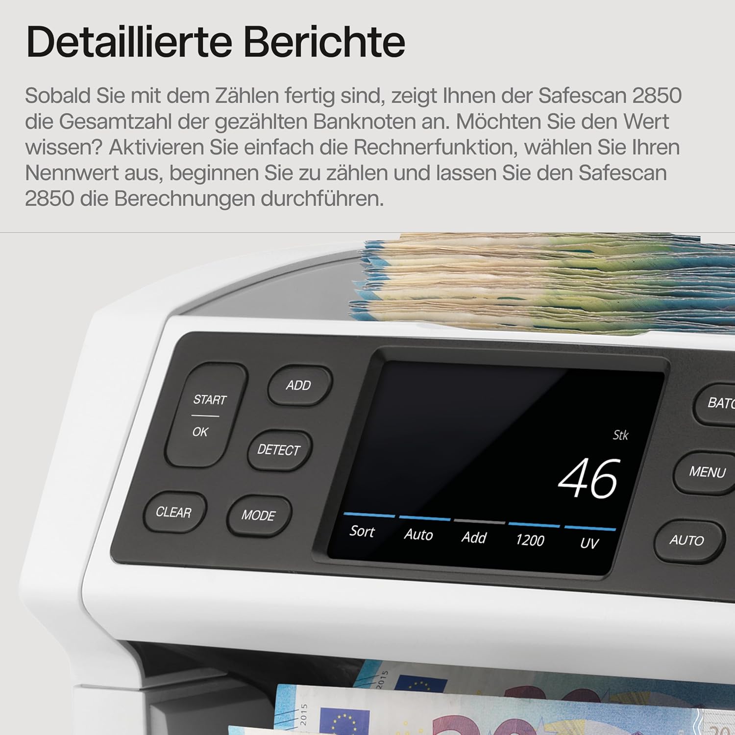 - ZÄHLERGEBNISSE LÖSCHEN: Sobald die Zählung erfolgt ist, zeigt der Safescan 2850 die Gesamtmenge der gezählten Banknoten an. Möchten Sie den Gesamtwert Ihrer Zählsitzung erfahren? Aktivieren Sie einfach die Rechnerfunktion, fangen an zu zählen und
