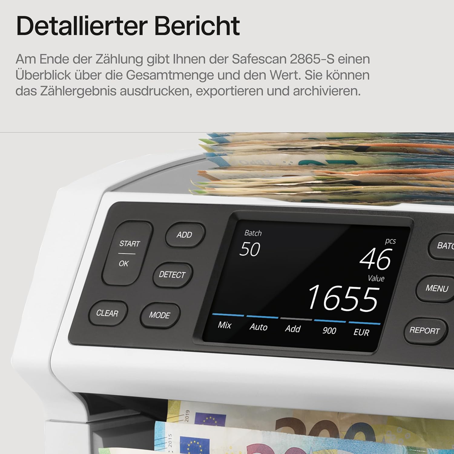 - SCHNELLES UND GENAUES ZÄHLEN: Im Handumdrehen abrechnen! Der Safescan 2865-S zählt schnell gemischte Banknoten und prüft gleichzeitig deren Echtheit. Er kann sogar bis zu drei verschiedene Währungen gleichzeitig zählen und überprüfen. Eine