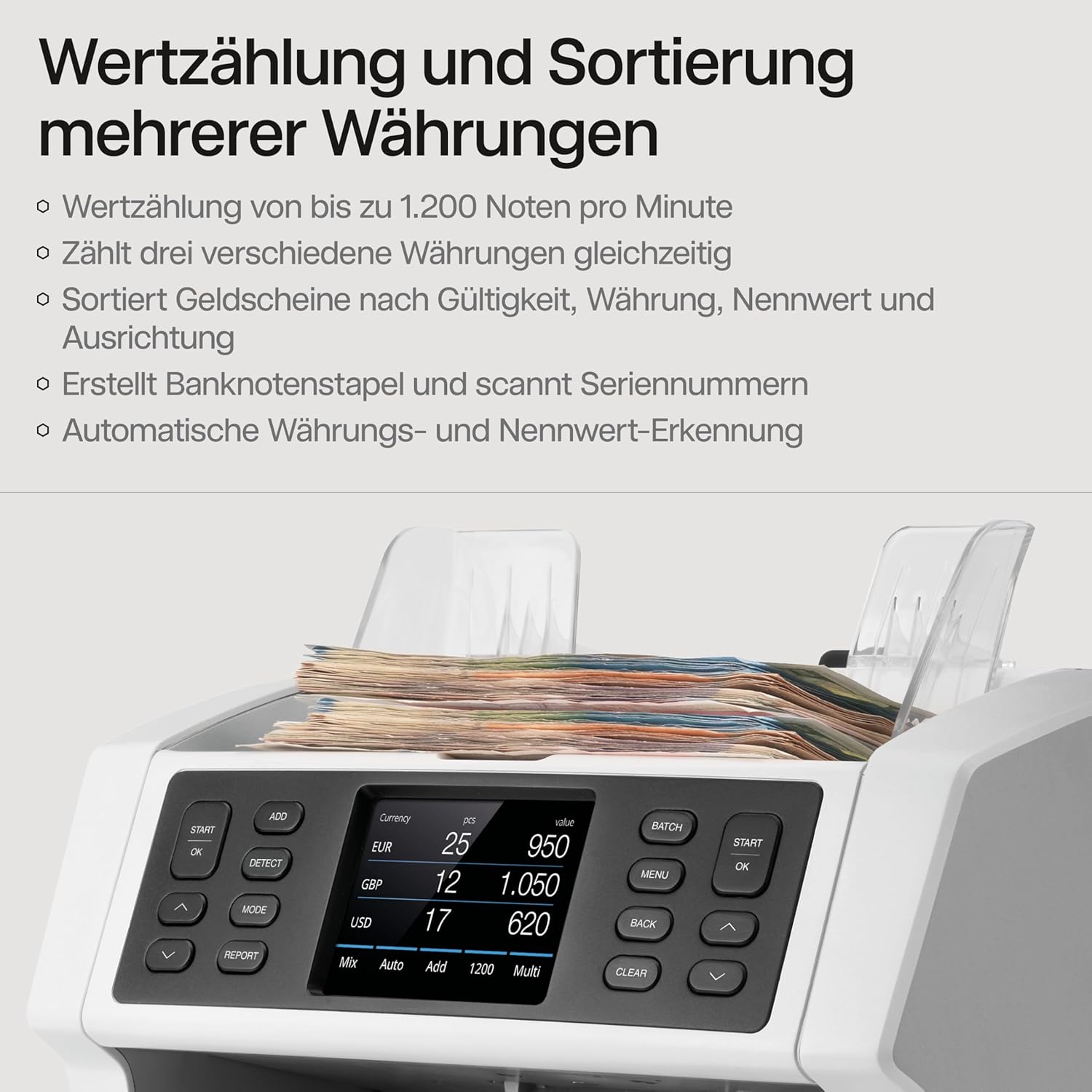 - ZEITSPARENDE FUNKTIONEN: Sparen Sie wertvolle Zeit mit den praktischen Zählfunktionen: Wählen Sie die Additionsfunktion, um die Zählungen über mehrere Läufe hinweg automatisch zu addieren oder erstellen Sie mit der Stapelfunktion Banknoten-Stapel;