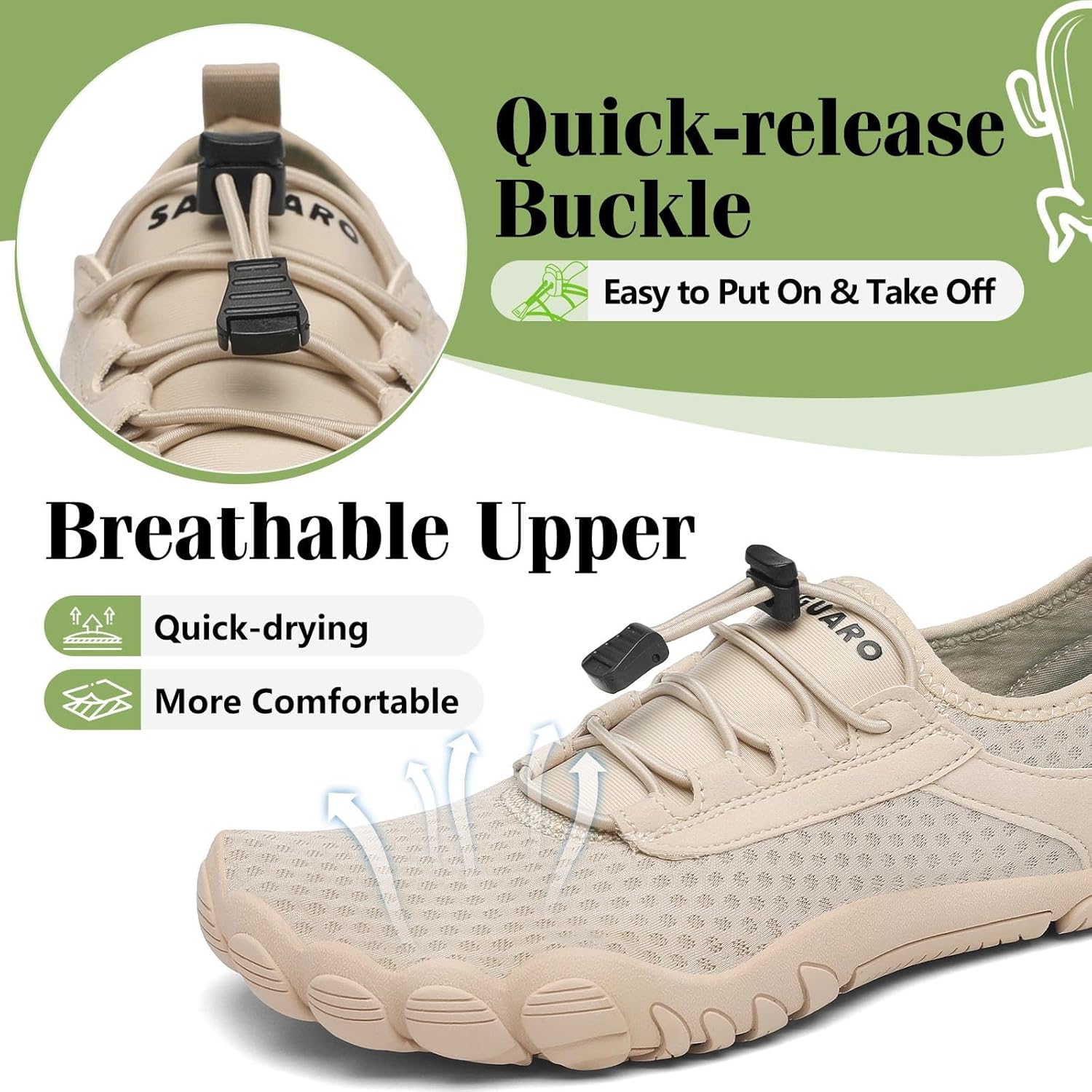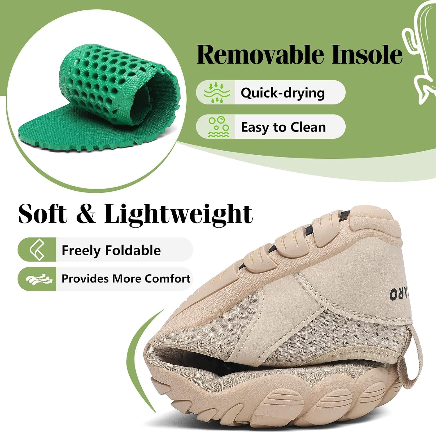 - Geräumige Zehenbox: Das grosszügige Design der Zehenbox bietet ausreichend Platz für die Zehen und verhindert Druckstellen, wodurch die Bewegung natürlicher und angenehmer wird. Egal, ob beim Gehen im Wasser oder beim langen Tragen - es sorgt für