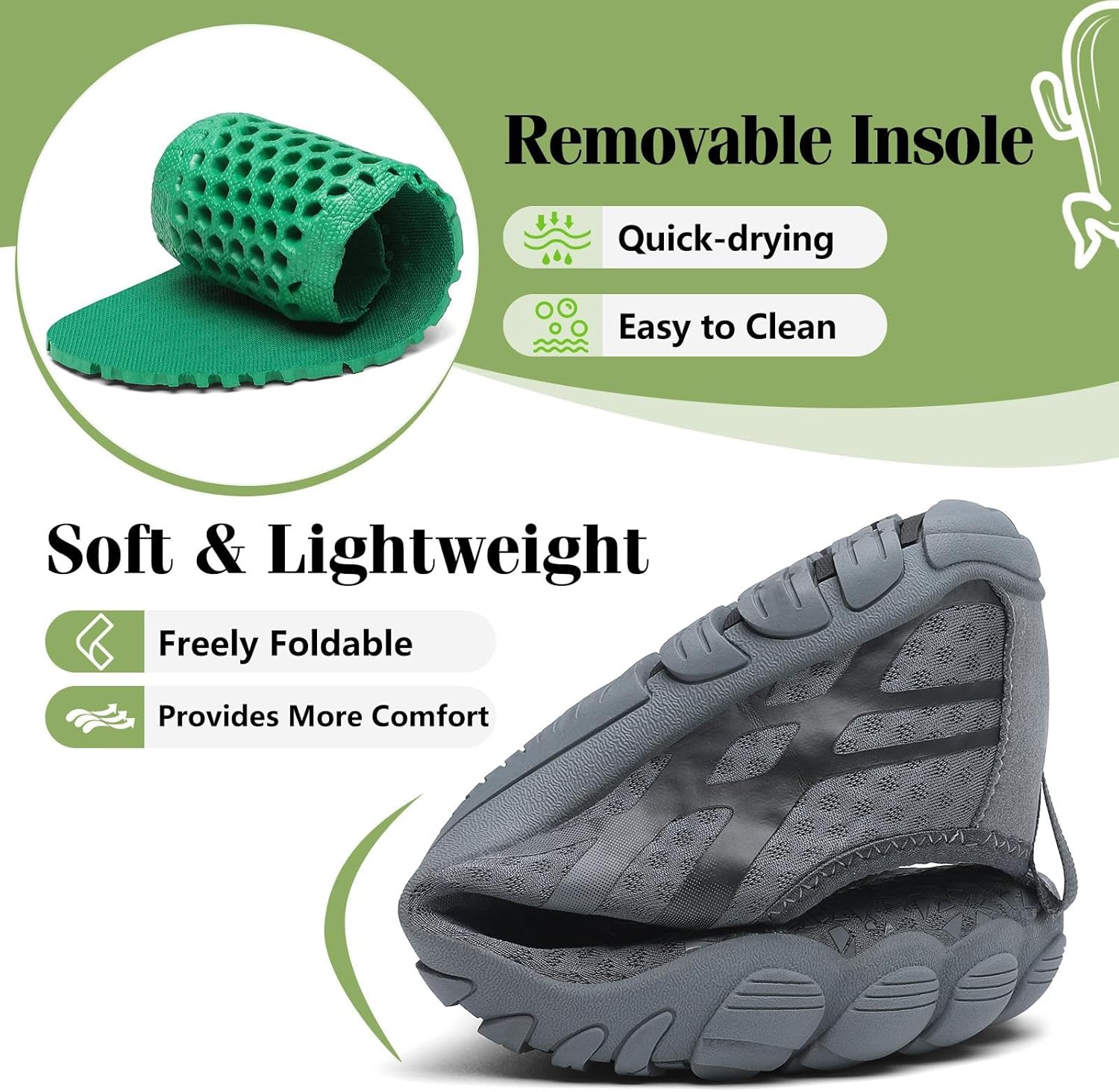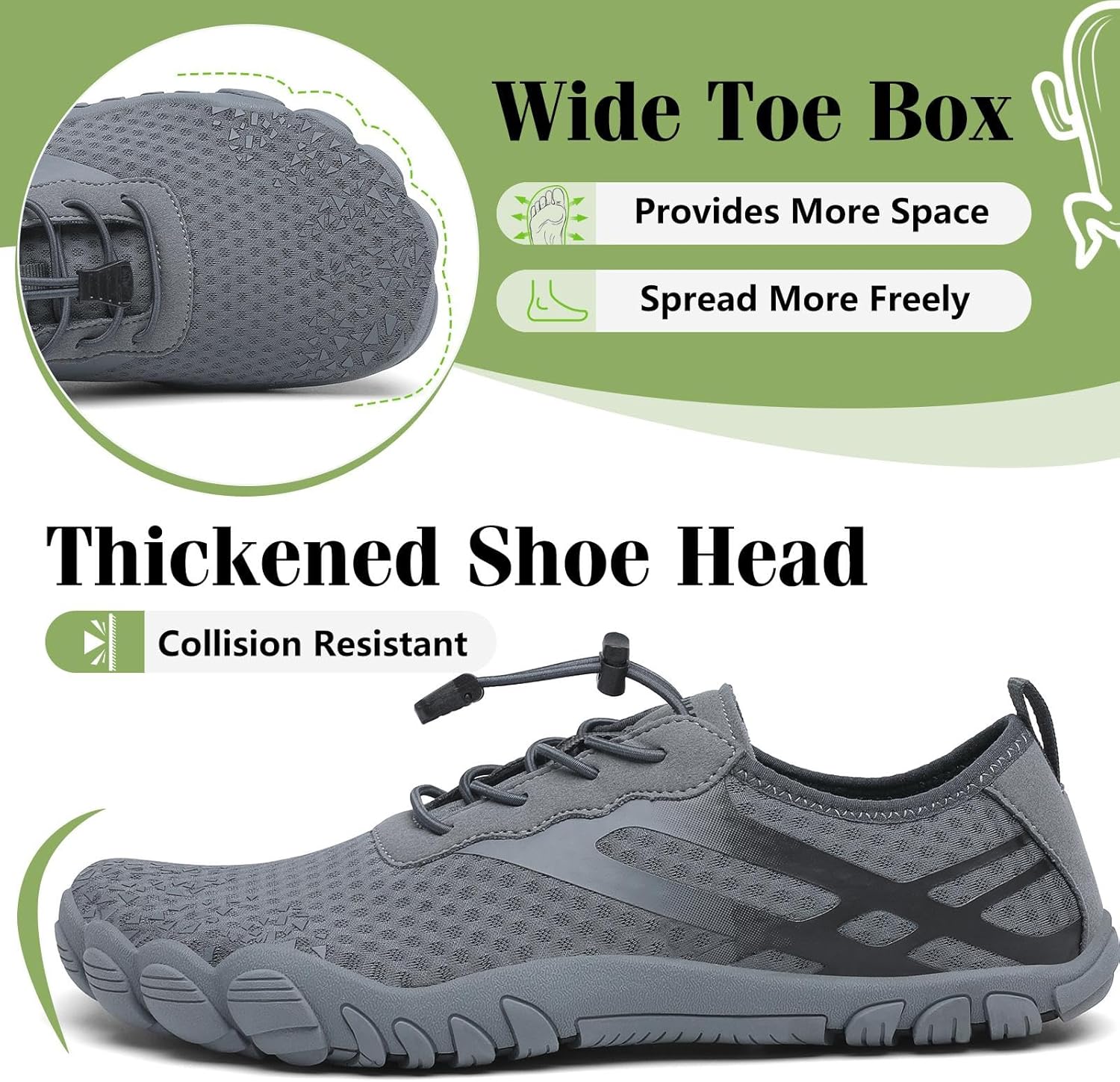 - Geräumige Zehenbox: Das grosszügige Design der Zehenbox bietet ausreichend Platz für die Zehen und verhindert Druckstellen, wodurch die Bewegung natürlicher und angenehmer wird. Egal, ob beim Gehen im Wasser oder beim langen Tragen - es sorgt für