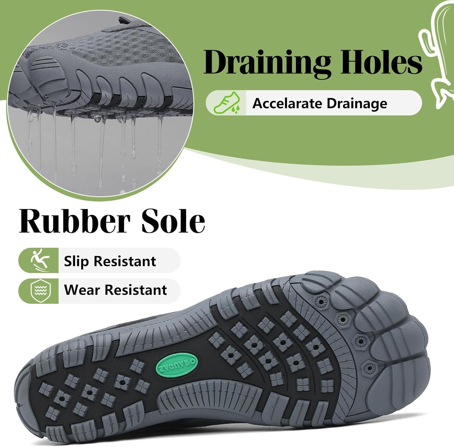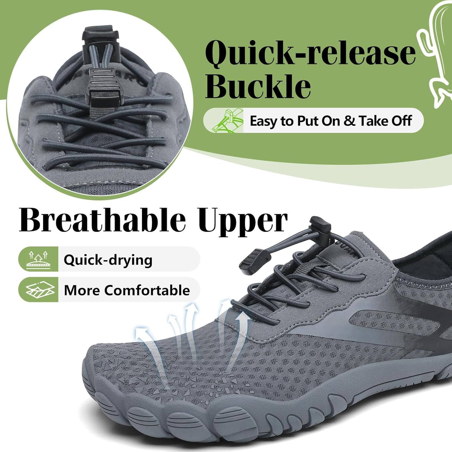 - Verstärkte Zehenkappe: Die vordere Schuhpartie ist speziell verstärkt, um die Haltbarkeit zu verbessern. Sie bleibt auch bei Kontakt mit Steinen oder Sand stabil und eignet sich für verschiedene Wasseraktivitäten.