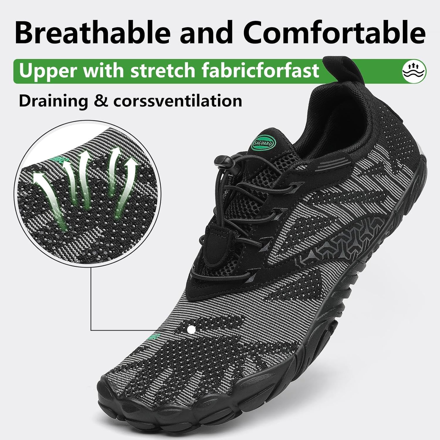 - Barfussschuhe :Das elastische Obermaterial ist ein atmungsaktives, ultraleichtes Material, das schnell abfliessen und überlüften kann. Dadurch trocknen die Schuhe schnell und schaffen eine kühle und gesunde Schuhumgebung.