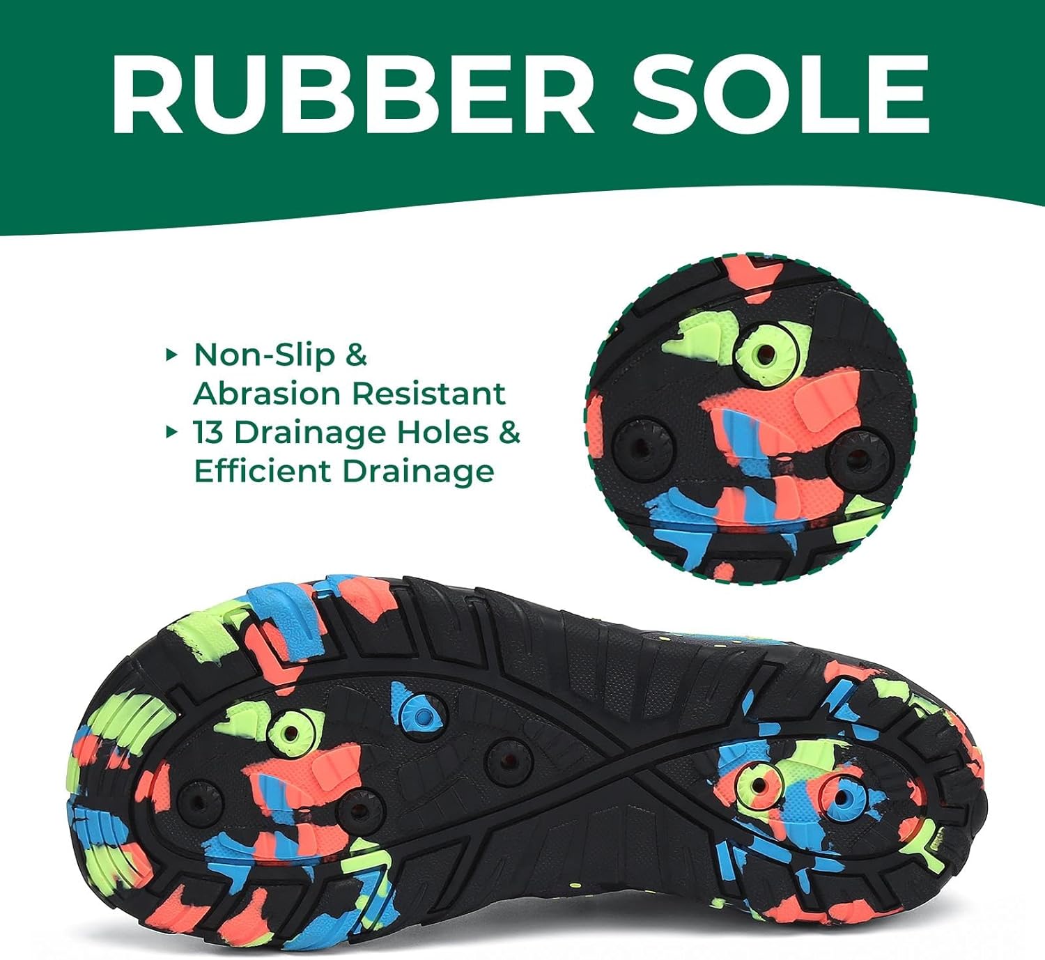 • Poröse Drainage: 7 Drainagelöcher an der Unterseite der Badeschuhe Kinder fördern das schnelle Abfliessen von Wasser und beschleunigen das Trocknen der Innenseite der Kinder-Wasserschuhe.