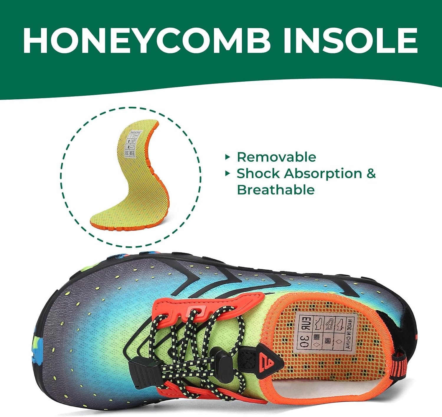 • Herausnehmbare Einlegesohle: Die Einlegesohle der Schwimmschuhe Kinder hat eine Wabenstruktur, ist leicht zu entwässern und atmungsaktiv. Die Einlegesohlen der Kinder Schwimmschuhe sind herausnehmbar, leicht zu reinigen oder zu ersetzen.