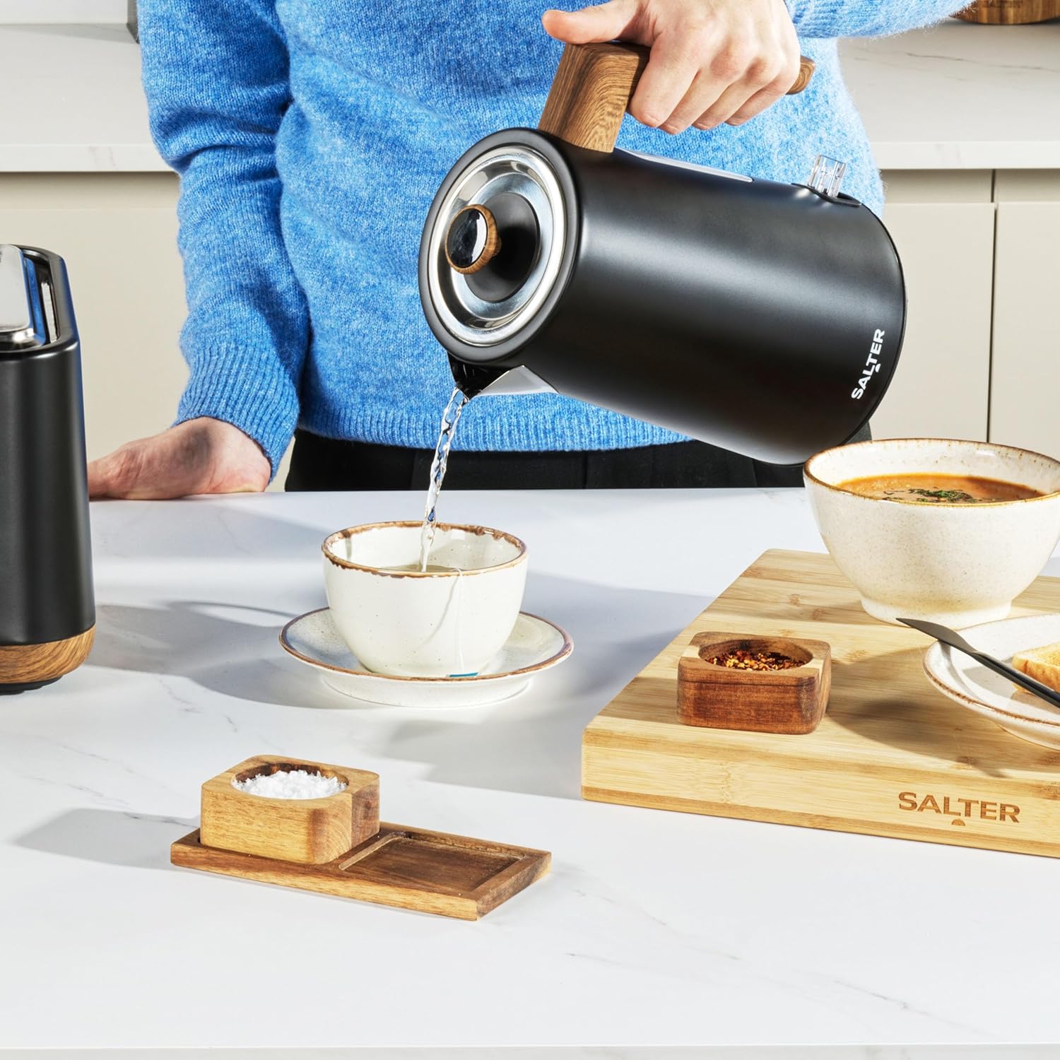 - Stilvolles Design in Holzoptik: Der matte schwarze Wasserkocher mit Akzenten in Holzoptik verleiht Ihrer Küche einen modernen skandinavischen Look