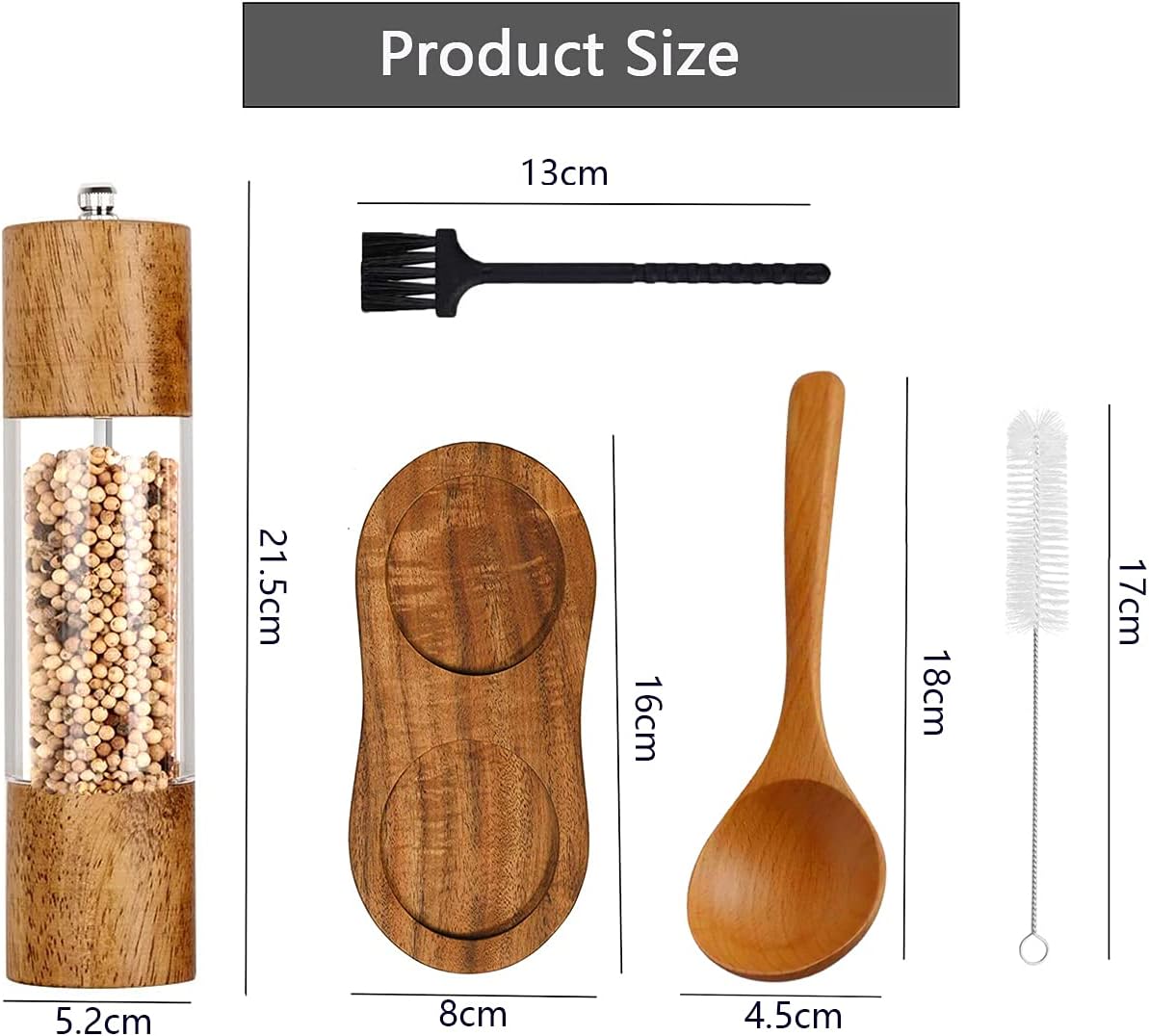 - 【Einfach zu bedienen】Inhalt: 2 x Holz Gewürzmühle (Höhe 21,5 cm, Ø 5,2 cm), 1 x Pfeffermühle Untersetzer, 1 x Löffel, 2 x Reinigungsbürste. Dieses Holzuntersetzer hilft Ihnen, alle losen Gewürze davon abzuhalten, auf Ihre Arbeitsplatte zu