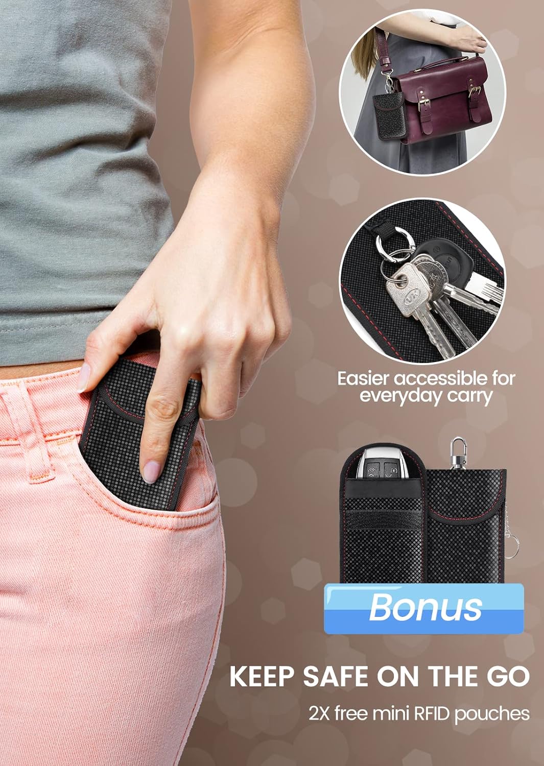 - Zusätzliche tragbare Abschirmung – 2 Faraday bags im Taschenformat werden mit der Keyless Go Schutz box geliefert, sodass Sie beruhigt sein können, indem Sie Ihr Auto vor Diebstahl mit schlüssellosem Zugang schützen, egal wo Sie parken, in einem