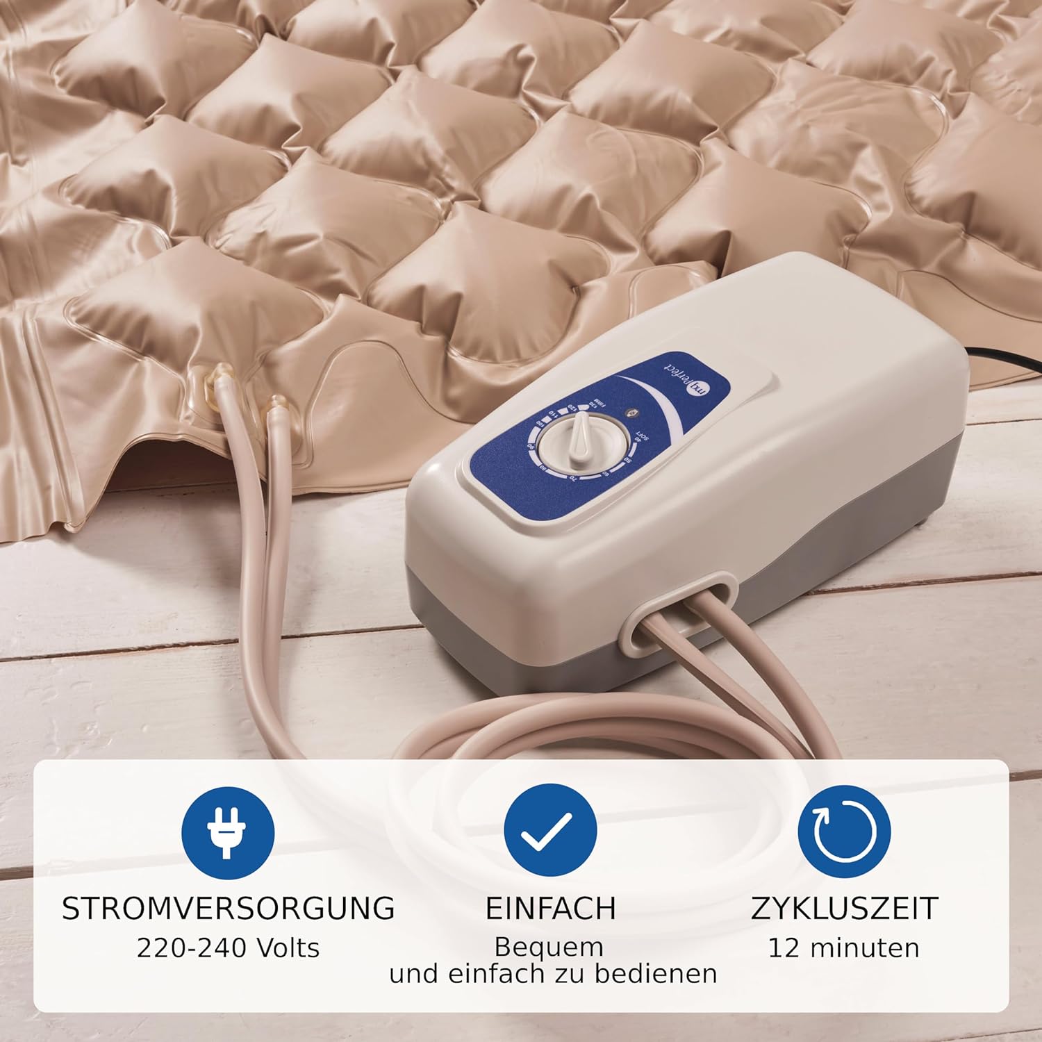 - Kein Wundliegen mehr - Diese aufblasbare Matratze verfügt über Lufttaschen, die sich abwechselnd aufblasen und entleeren, um den Druck auf Ihren Körper zu verringern, wenn Sie auf dem Rücken liegen
