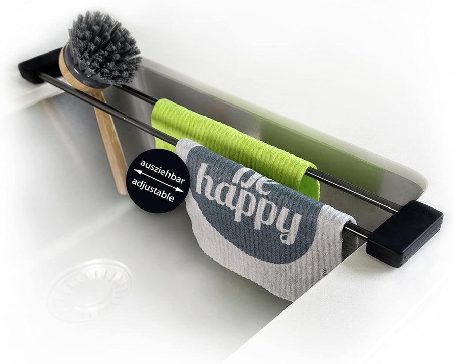 - PRAKTISCH u. FLEXIBEL: Der flexible Lappenhalter ist nur 33 x 5 x 2cm gross, aber flexibel verlängerbar bis zu 56,5 cm. Das flexible Geschirr-Abtropfgestell für Ihre Küche passt sich somit fast jeder Spüle an. Zerkratzt Ihre Spüle nicht dank weichen