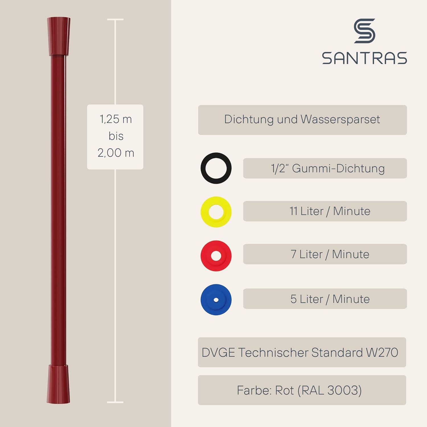 SANTRAS® Duschschlauch PREMIUM Rot 1,25 m mit Durchflussbegrenzer – Besonders flexibler Brauseschlau
