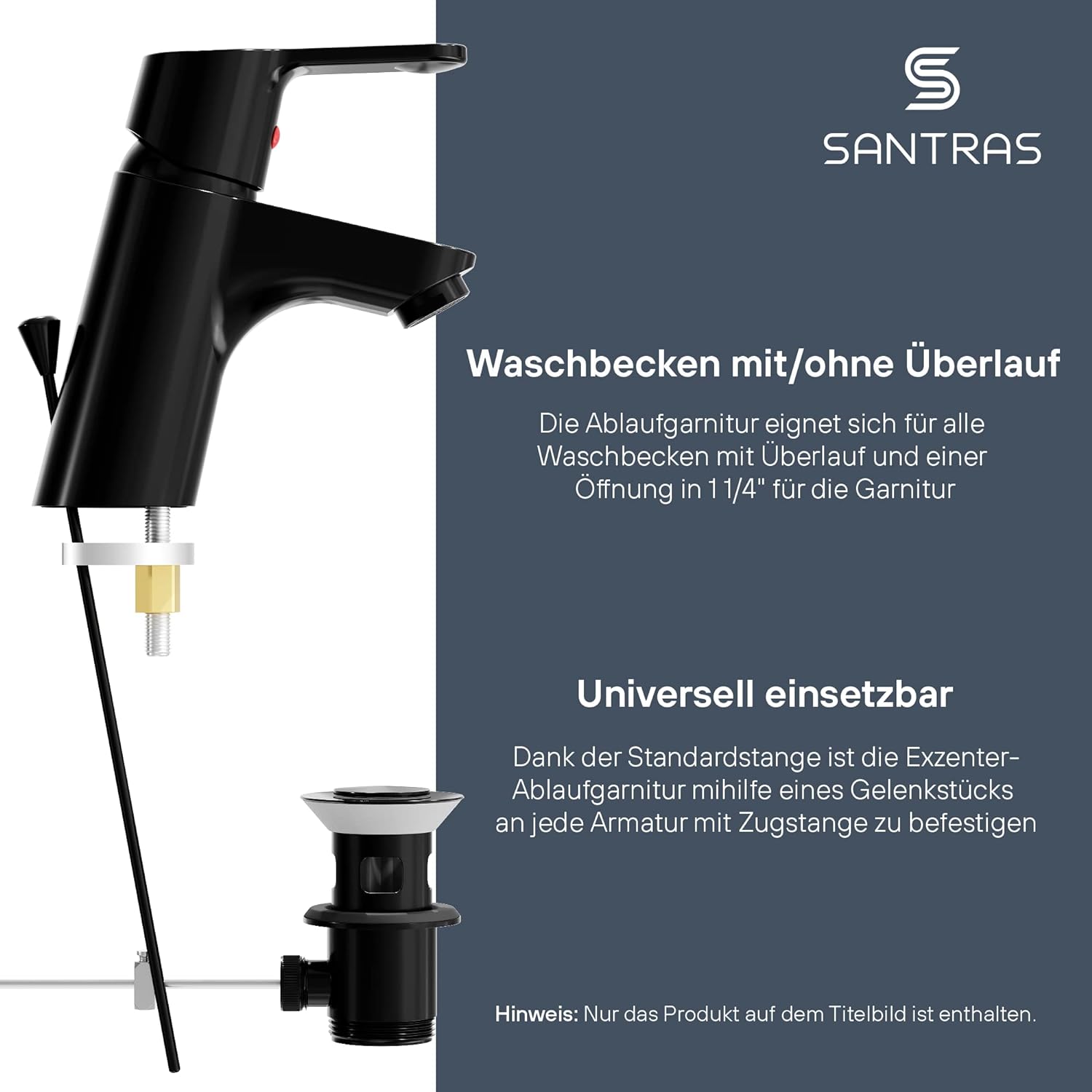 - 🚿 UNIVERSELL EINSETZBAR – Unsere Ablaufgarnitur kann aufgrund seiner Standardgrösse von 1 ¼ Zoll in gängige Waschbecken mit Überlaufschutz eingebaut werden. Durch unser Gelenkstück kann jede Zugstange mit der Garnitur verbunden werden, sodass