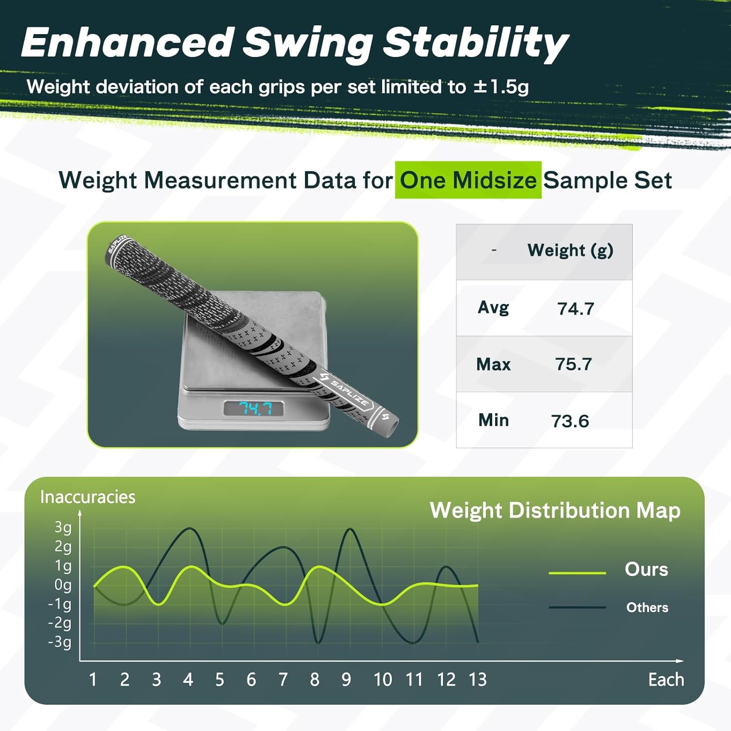 - Nice Consistency of Grips: The weight deviation of the 13 grips set is limited to +/-1.5 g. Comparing with the industry standard of +/- 3 g, this will greatly enhance your swing stability and allow you to fully enjoy your golfing time