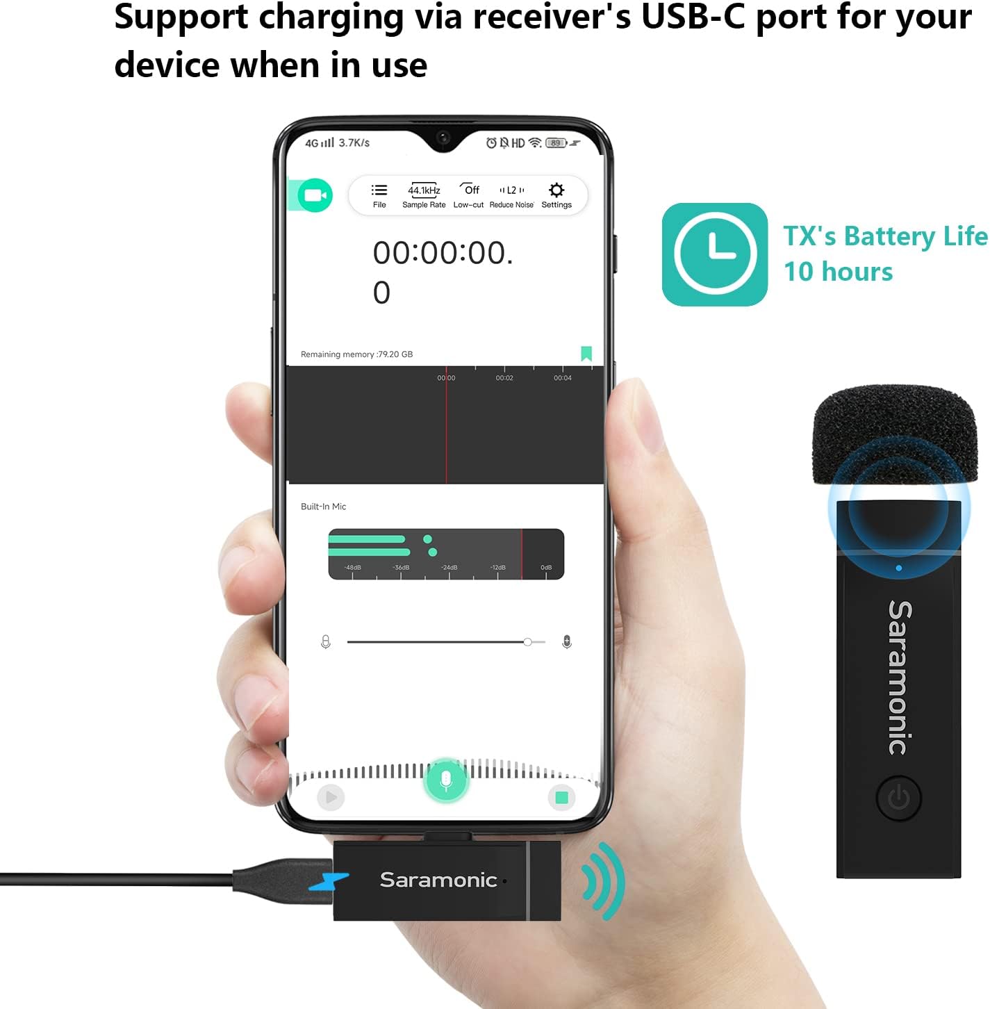 - ▶【Record While Charging】: The wireless lavalier microphone receiver has a USB-C port, allowing you to connect a charger to charge your phone while recording, perfect for live broadcasts and more. Supports up to 3A fast charging to quickly fully
