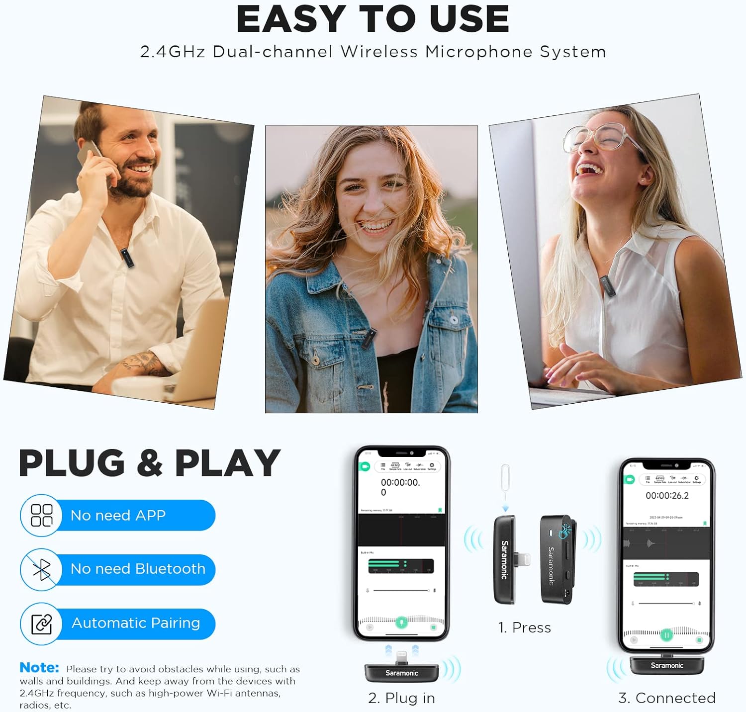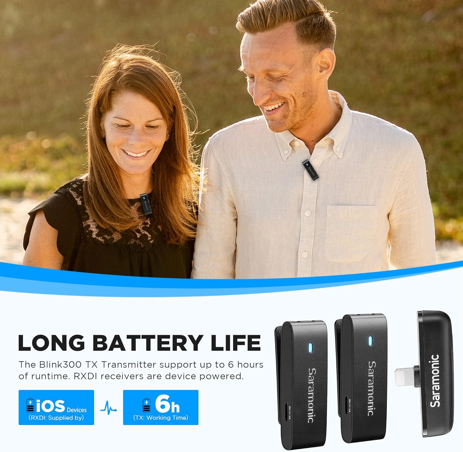 - Kabelloses Mikrofon für iPhone: Saramonic Blink 300 B4 kommt mit einem MFi-zertifizierten Lightning-Port-Empfänger und 2 wiederaufladbaren Sendern. Es ist ein professionelles, kabelloses Lavalier-Mikrofon für iPhone-/iPad-Videoaufnahmen, unterstützt