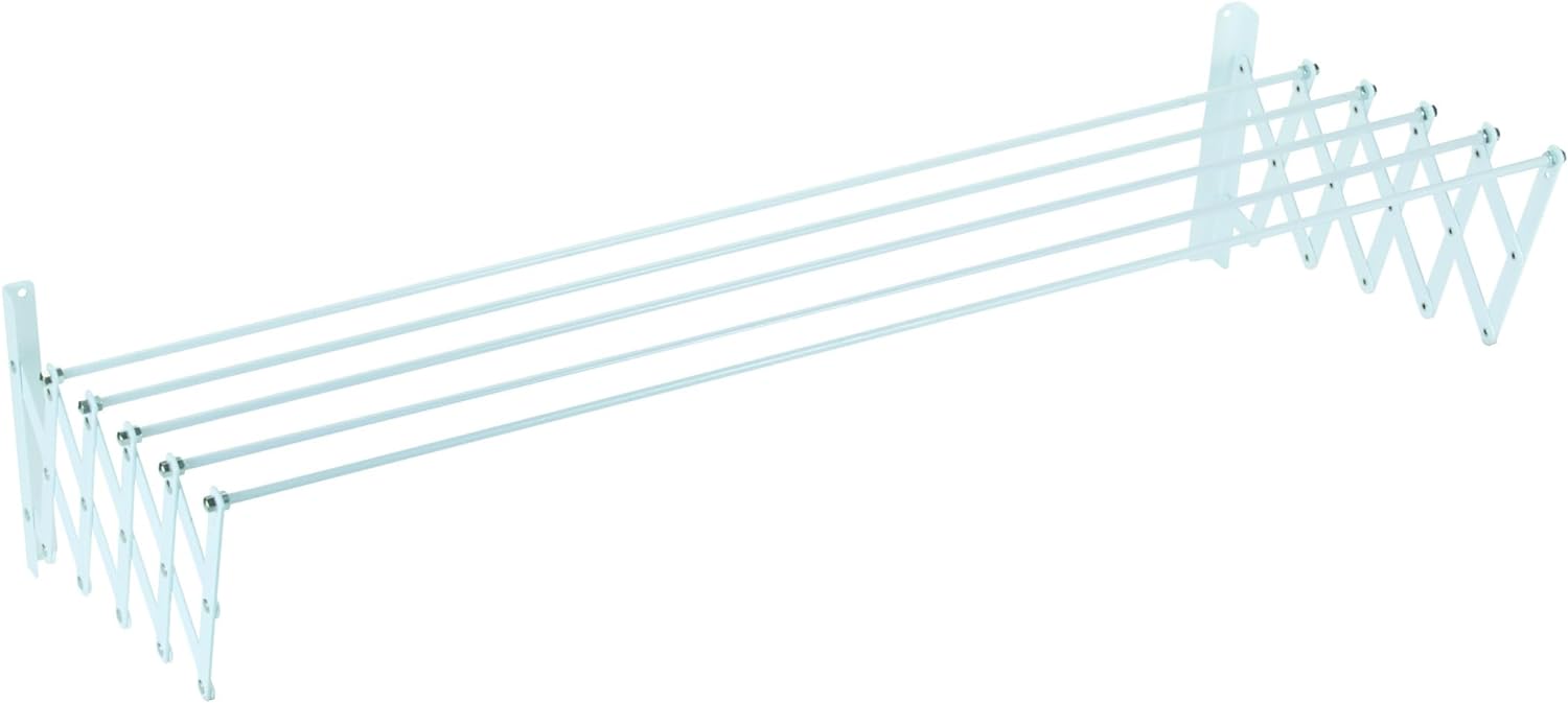 • "Ausziehbarer Wand-Wäscheaufhänger aus Stahlstreifen und 5 Stahlstäben von 80 cm Länge mit weisser, korrosionsbeständiger Kunststoffbeschichtung. Diese Beschichtung bietet lang anhaltenden Schutz vor Korrosion, Stössen und Kratzern, Verwitterung