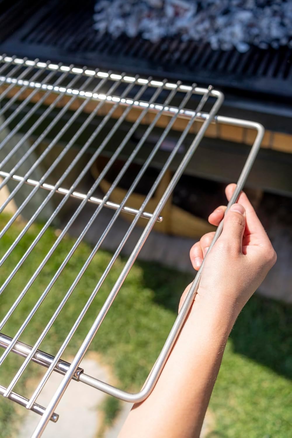 - Rost mit ausziehbarem Rahmen von 62,5 bis 72,5 cm, der sich perfekt an die Grösse des Grills anpasst, ohne ihn zurechtschneiden zu müssen bzw. ohne Erfordernis einer speziellen Grillgrösse. Es wird empfohlen, den Rost nicht um mehr als 10 cm