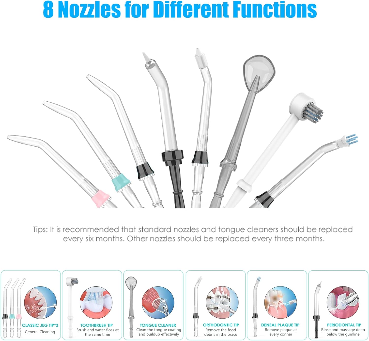 - 【8 Düsen für verschiedene Reinigungsanforderungen】 Die Munddusche ist mit 3 gewöhnlichen Hochdruckspitzen und 5 speziellen Düsenspitzen ausgestattet. Der um 360° drehbare Düsenkopf erreicht alle Mundbereiche für eine gründliche und