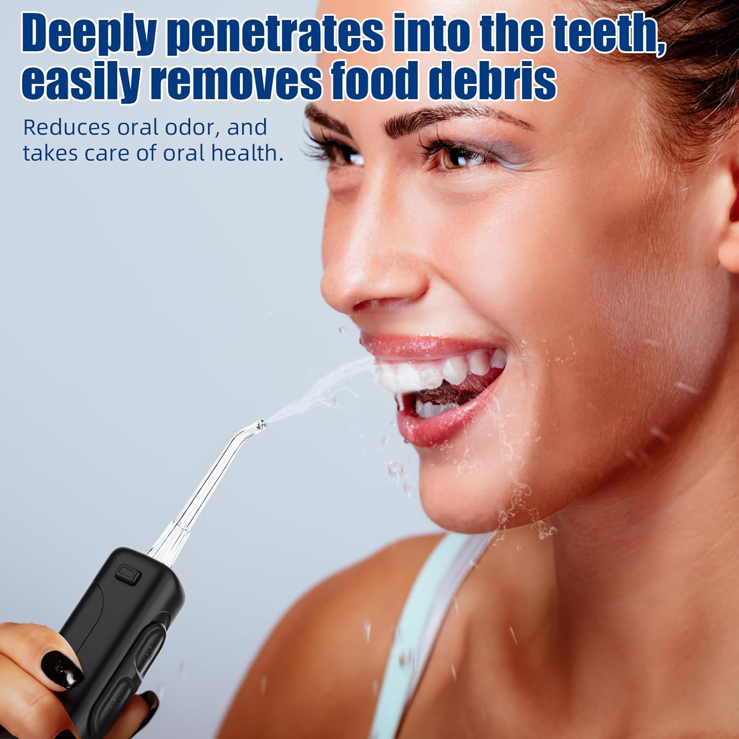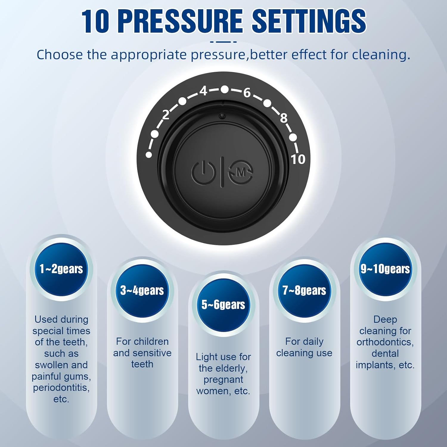 - [ 10 Einstellbare Wasserdruckeinstellungen ] - Munddusche Drehknopf ist es, den Start drücken und ändern Sie den Gang, und drehen, um den Wasserdruck der Gang einzustellen. Hochdruck-Puls-Technologie: 1200-1800/min, erfüllen die Bedürfnisse aller