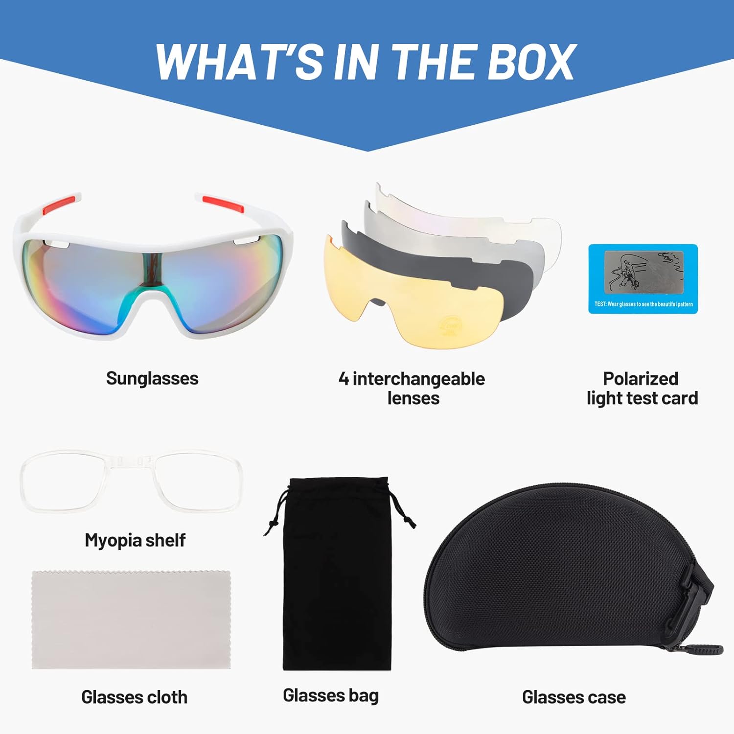 • ZUBEHÖR: Das Sport fahrradbrille mit 1 polarisierte sonnenbrille, 4 austauschbare Originalgläser, 1 Brillenetui, 1 Brillenputztuch, 1 Brillenbeutel, 1 Testkarte polarisierte Gläser, 1 Innenrahmen für kurzsichtige Gläser . Sport sonnenbrille perfekt