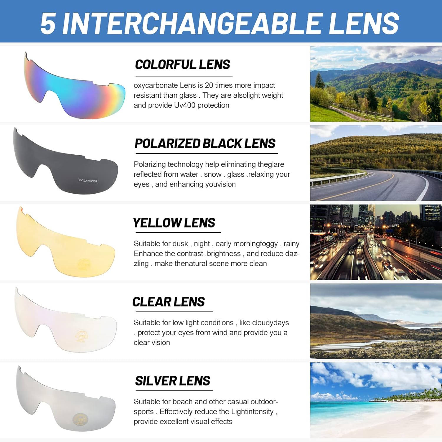 • Polarisierte Sonnenbrille mit 5 Wechselobjektive: 1. Schwarze polarisierte Gläser: eliminiert reflektiertes und gestreutes Licht. 2. Grüne Aurora-Beschichtung: HD klare Gläser. 3. Klare Beschichtungslinsen - verhindern das Eindringen von Regen und