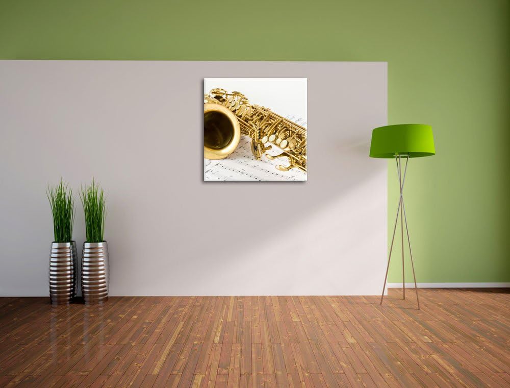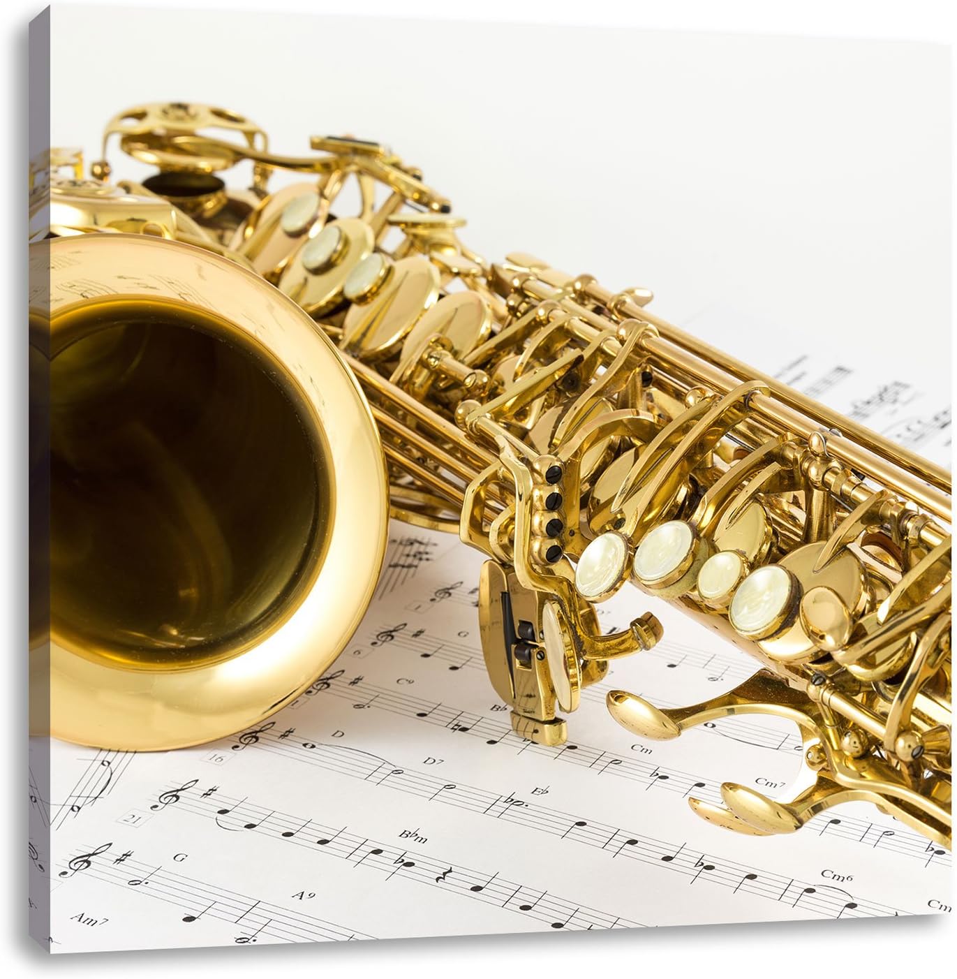 Saxophon auf Notenpapier, Format: 70x70 auf Leinwand, XXL riesige Bilder fertig gerahmt mit Keilrahm