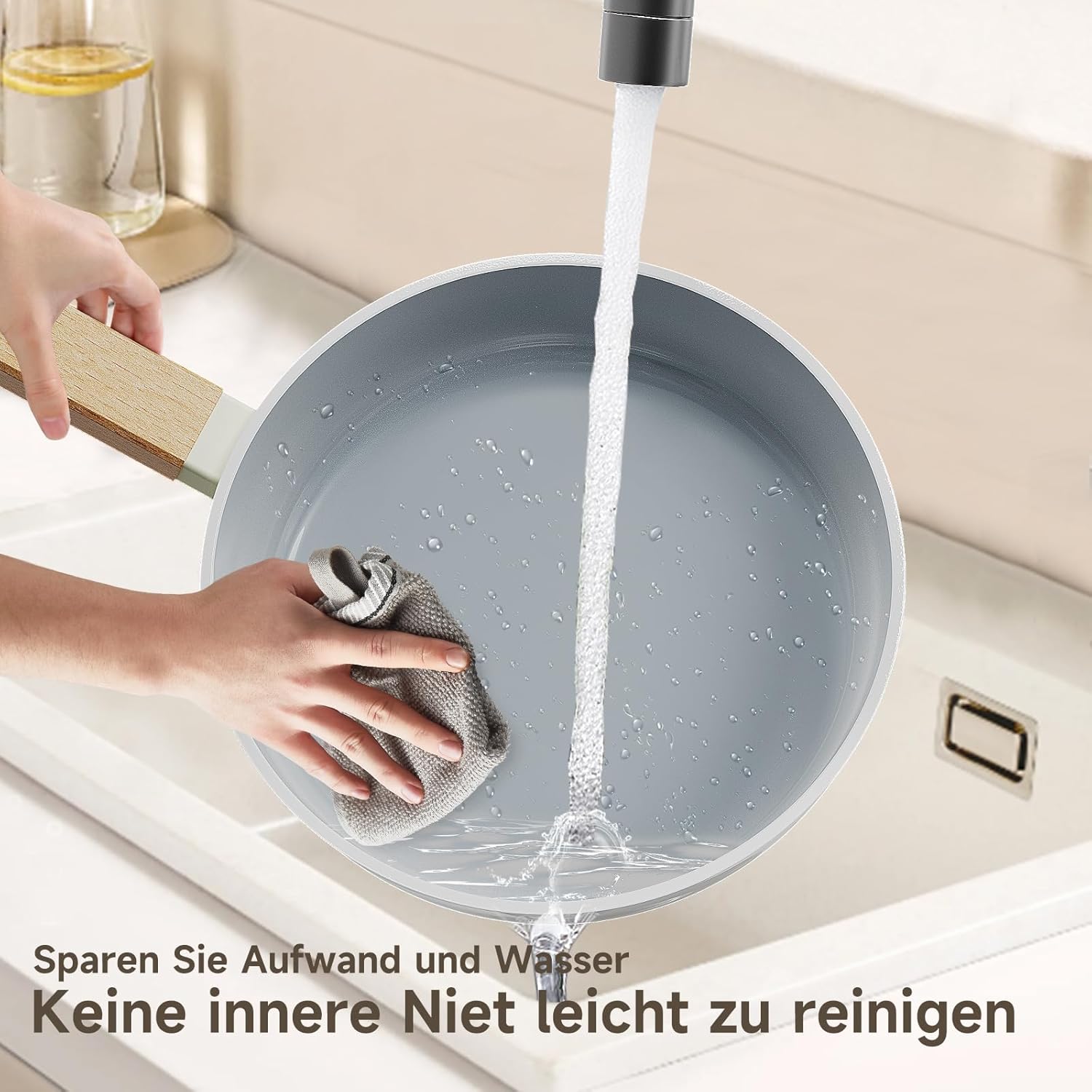 - Einfache Reinigung & pflegeleicht – Die glatte Keramikbeschichtung ermöglicht eine mühelose Reinigung – einfach mit einem weichen Schwamm abwischen. Nicht spülmaschinenfest & nicht backofengeeignet(wegen Holzgriff),Vermeiden Sie harte