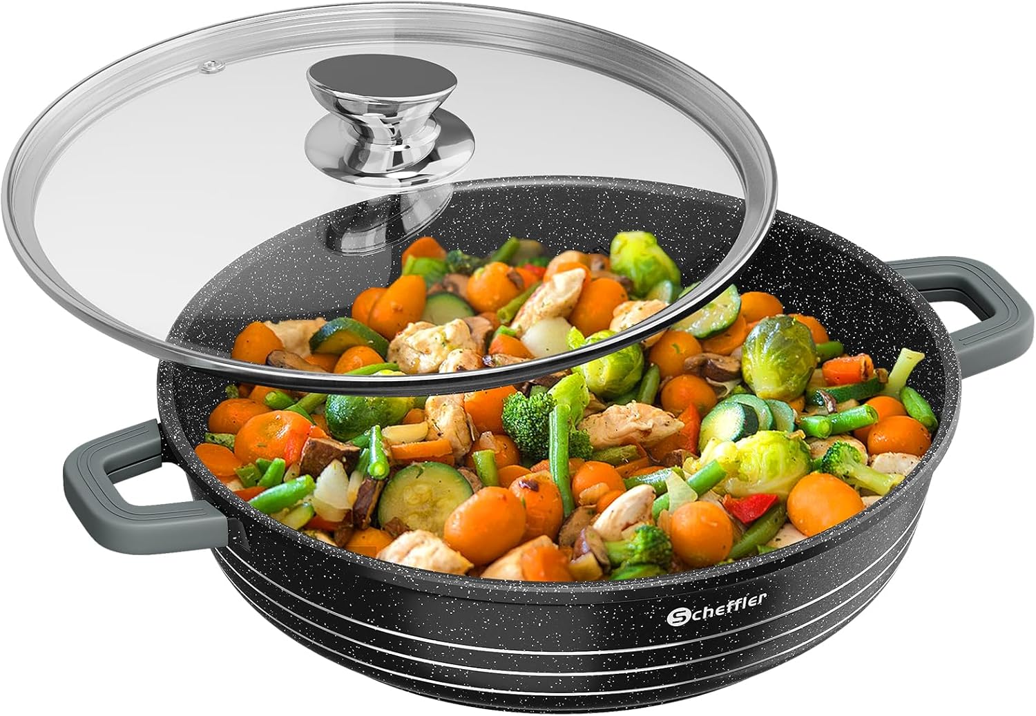 - Glasdeckel mit Edelstahlknauf - Hitzebeständiger Glasdeckel mit elegantem Edelstahlknauf – ideal zum Beobachten des Garvorgangs, während Dampf sicher entweichen kann.