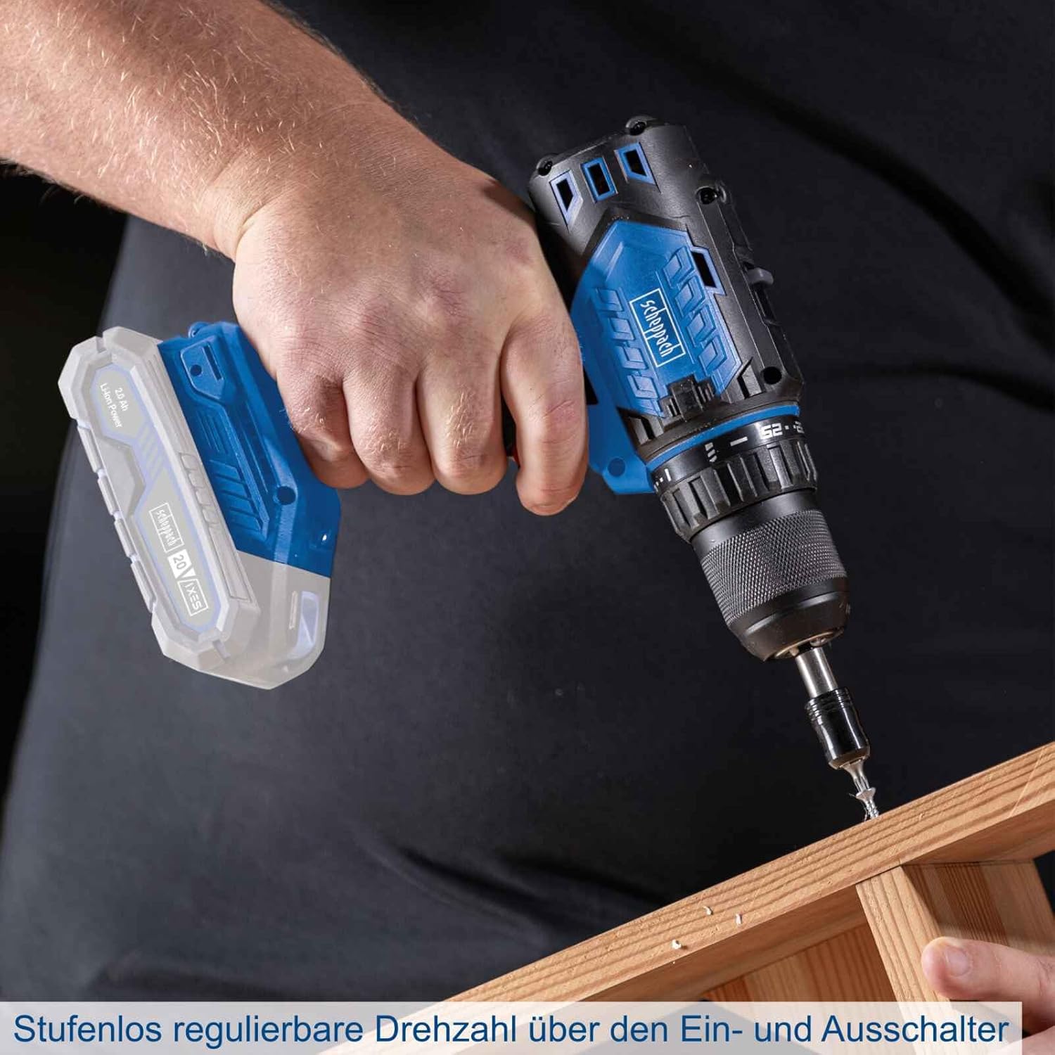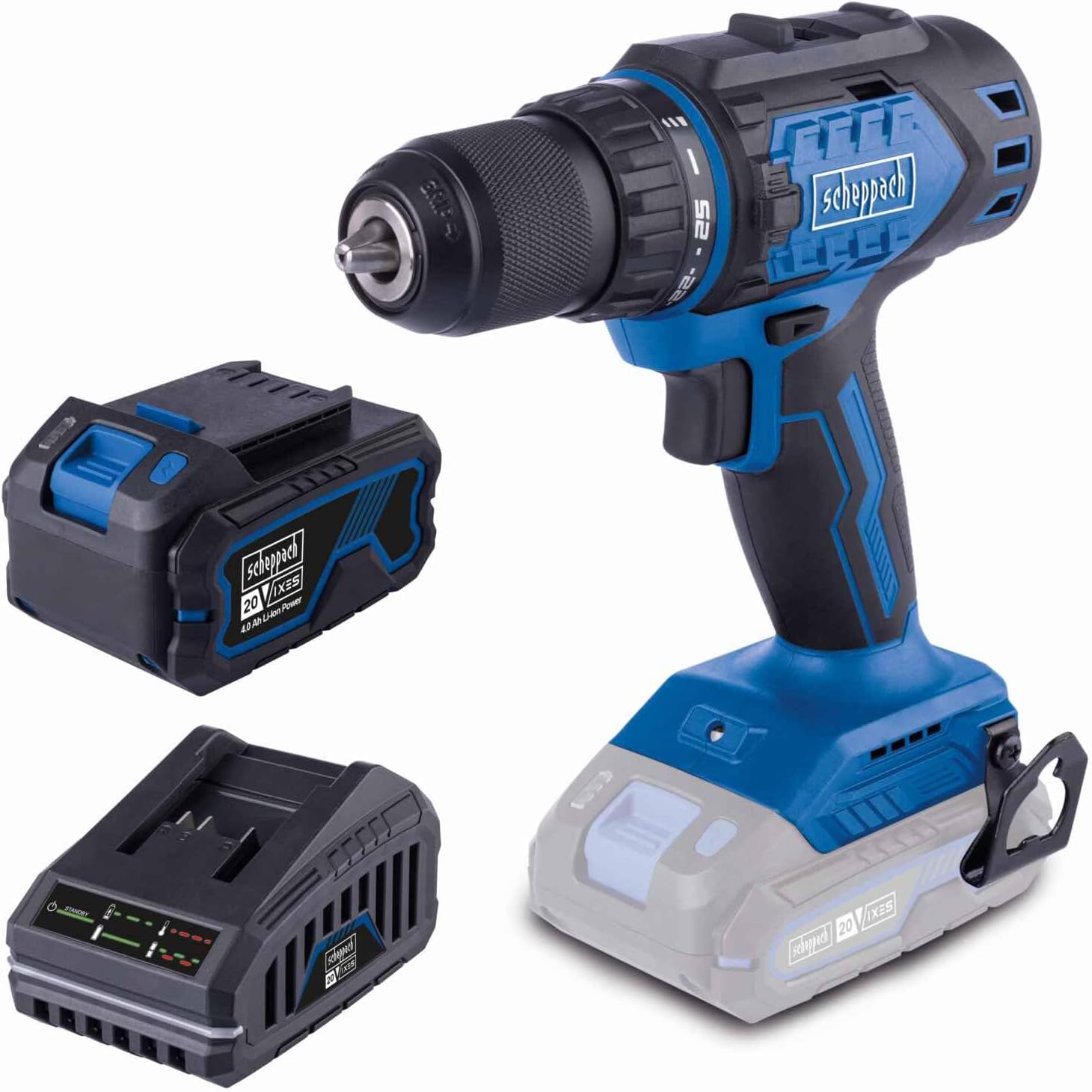 - Kabelloses Arbeiten mit der Scheppach IXES 20-Volt-Serie – alle Akkus und Ladegeräte aus der Systemreihe können mit dem Akku-Bohrschrauber kombiniert werden