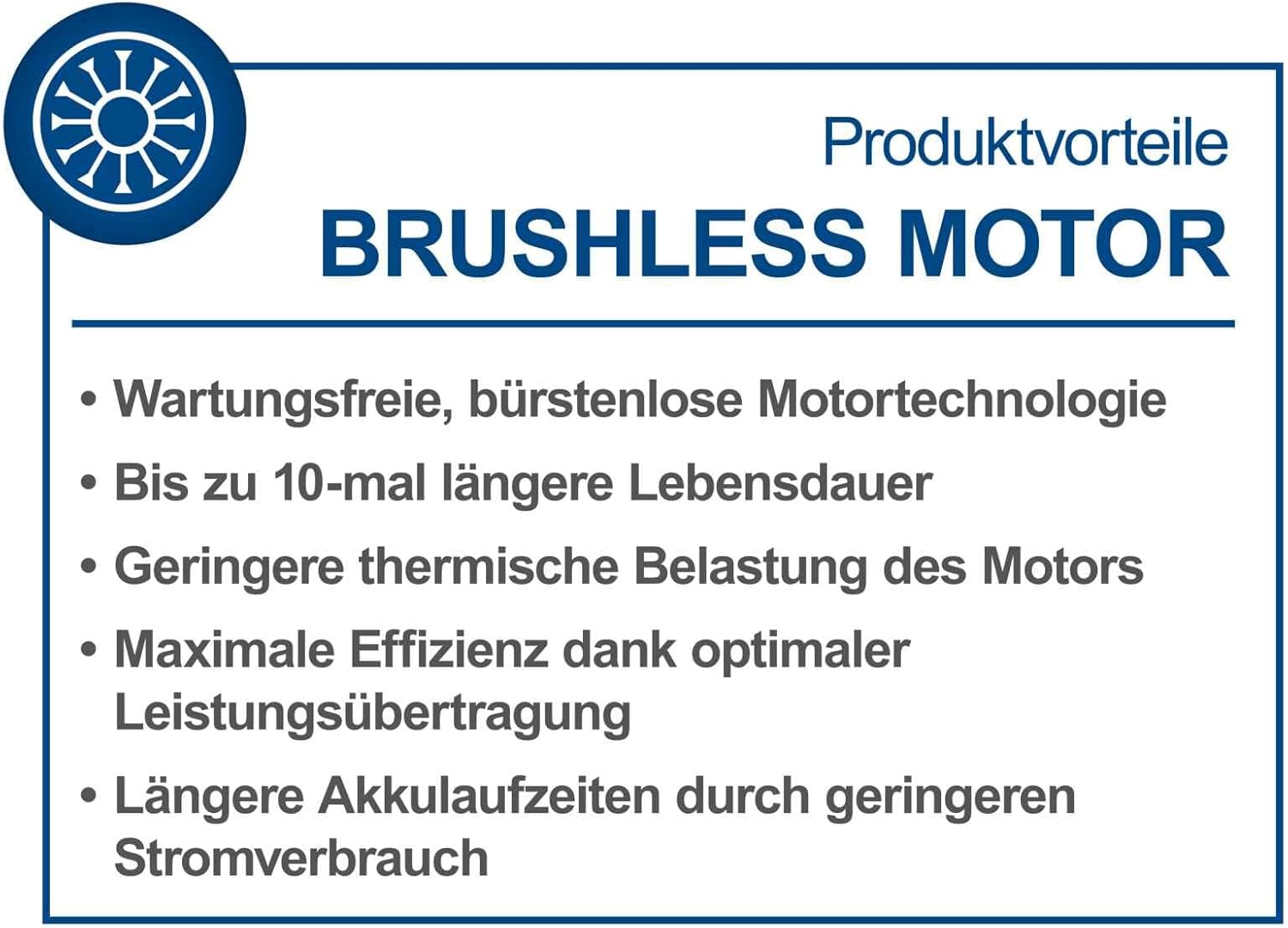 - Wartungsfreier, bürstenloser Motor (Brushless Motor) mit besonders hohem Wirkungsgrad, längerer Laufzeit, hoher Lebensdauer und geringem Verschleiss