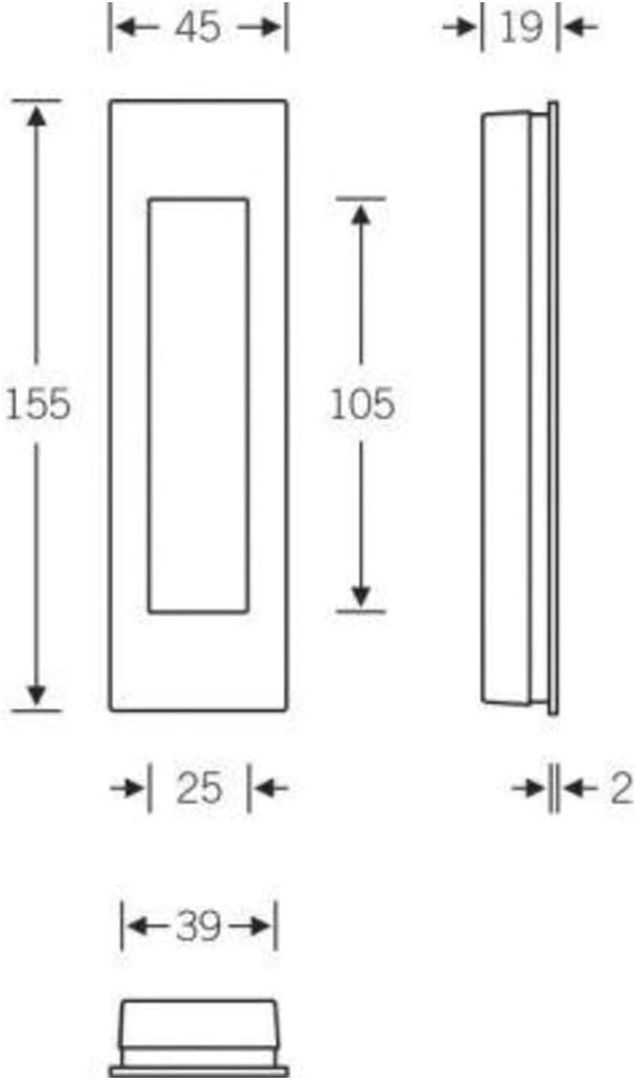 - Geschlossene, käntige Einlassmuschel für Schiebetüren, auch zur flächenbündigen Montage geeignet, nur ohne Schlüssel-Lochung lieferbar, Einlasstiefe 18,5 mm bei aufliegender Nutzung.