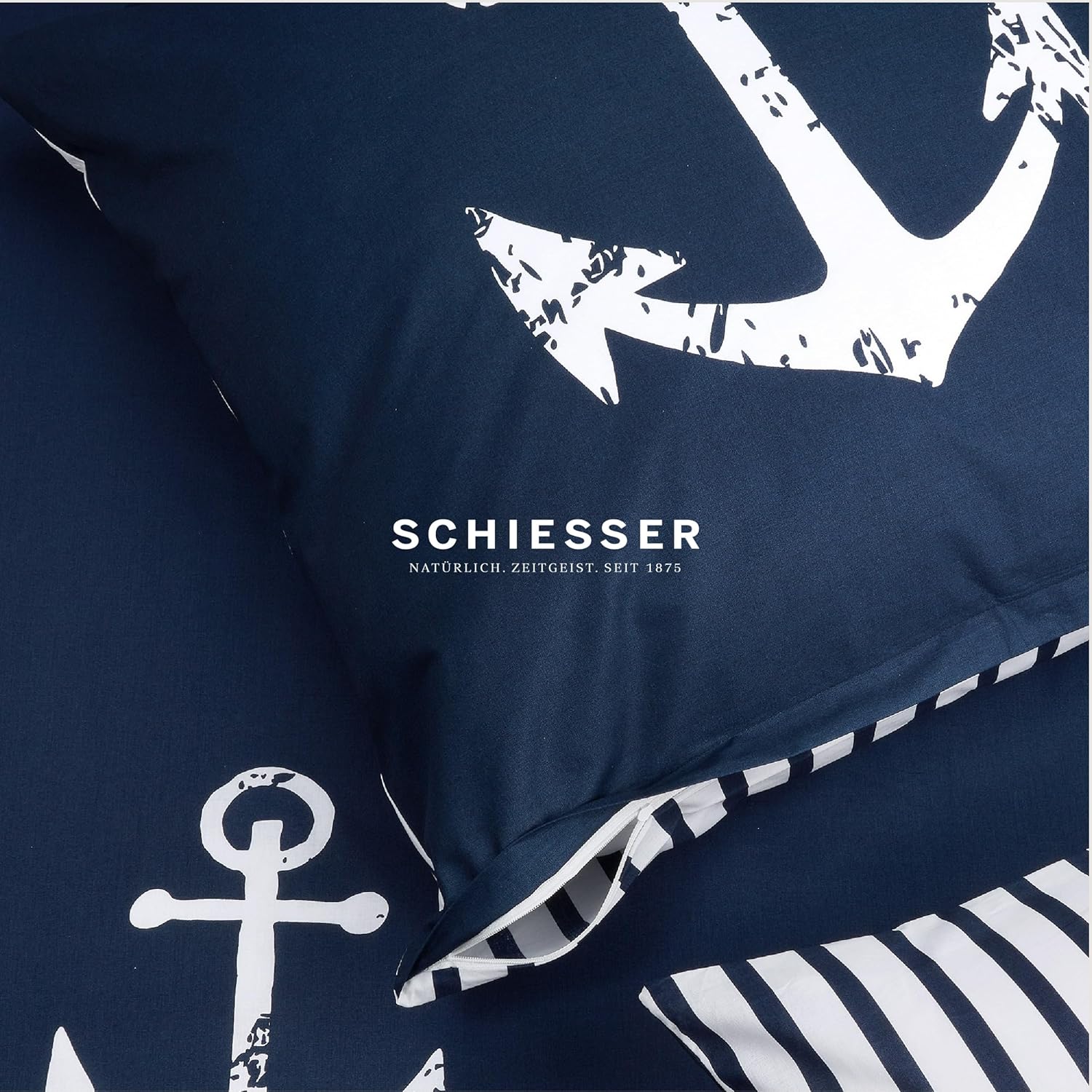 - SCHÖNE AUSSICHTEN. Ihr neues Schiesser Bettwäscheset in Wendeoptik besteht aus einem Bettbezug in der Grösse 135 x 200 cm oder 155 x 220 cm und einem Kissenbezug mit den Massen 80 x 80 cm. Der Reissverschluss garantiert Ihnen ein sehr einfaches Auf-