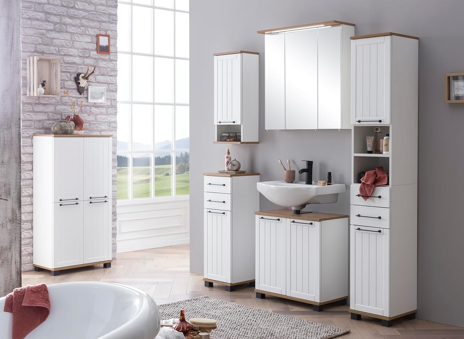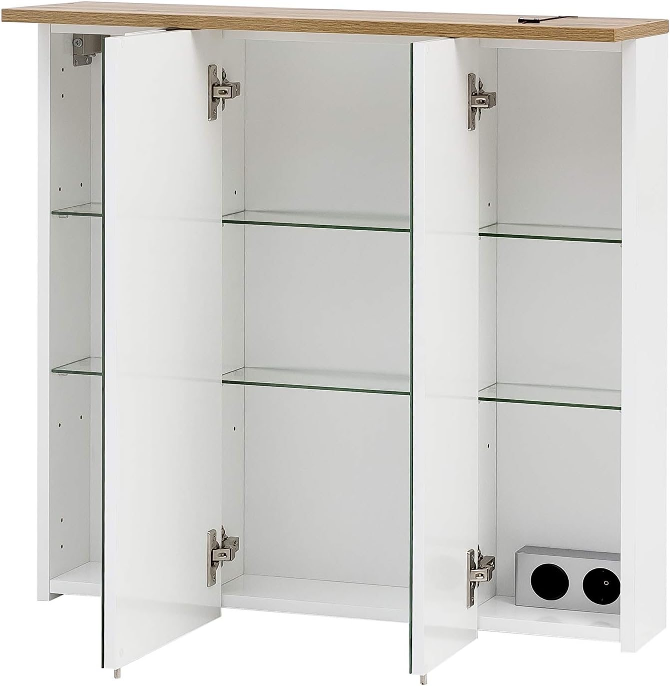 - Spiegelschrank mit drei Türen, LED-Leuchte und Steckdosenelement