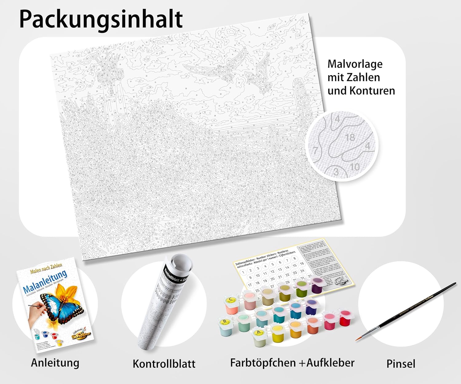 • Vollständiges Set - Der Lieferumfang beinhaltet 36 Acrylfarben auf Wasserbasis einen Malpinsel eine Anleitung eine Vorlage und 1 Leinwand mit dem Mass: 40 x 50 cm