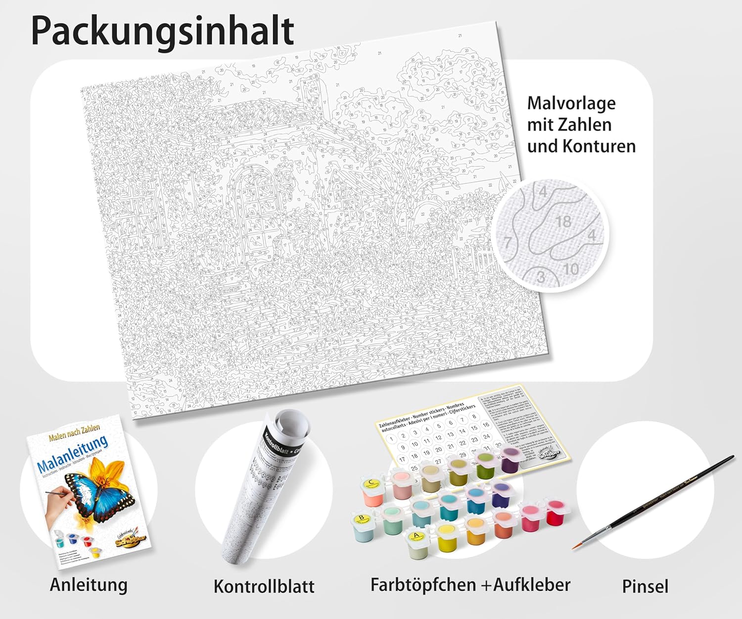 - Vollständiges Set - Der Lieferumfang beinhaltet 24 Acrylfarben auf Wasserbasis, einen Malpinsel, eine Anleitung, eine Vorlage und eine Malvorlage mit dem Mass 24 x 30 cm