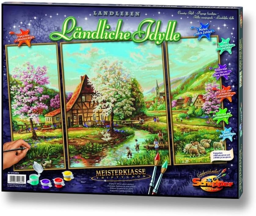 • Vollständiges Set - Der Lieferumfang beinhaltet Acrylfarben auf Wasserbasis, einen Malpinsel, eine Anleitung, eine Vorlage und 3 Leinwände: 1 Mittelbild: 50 x 40 cm, 2 Seitenbilder: 50 x 20 cm