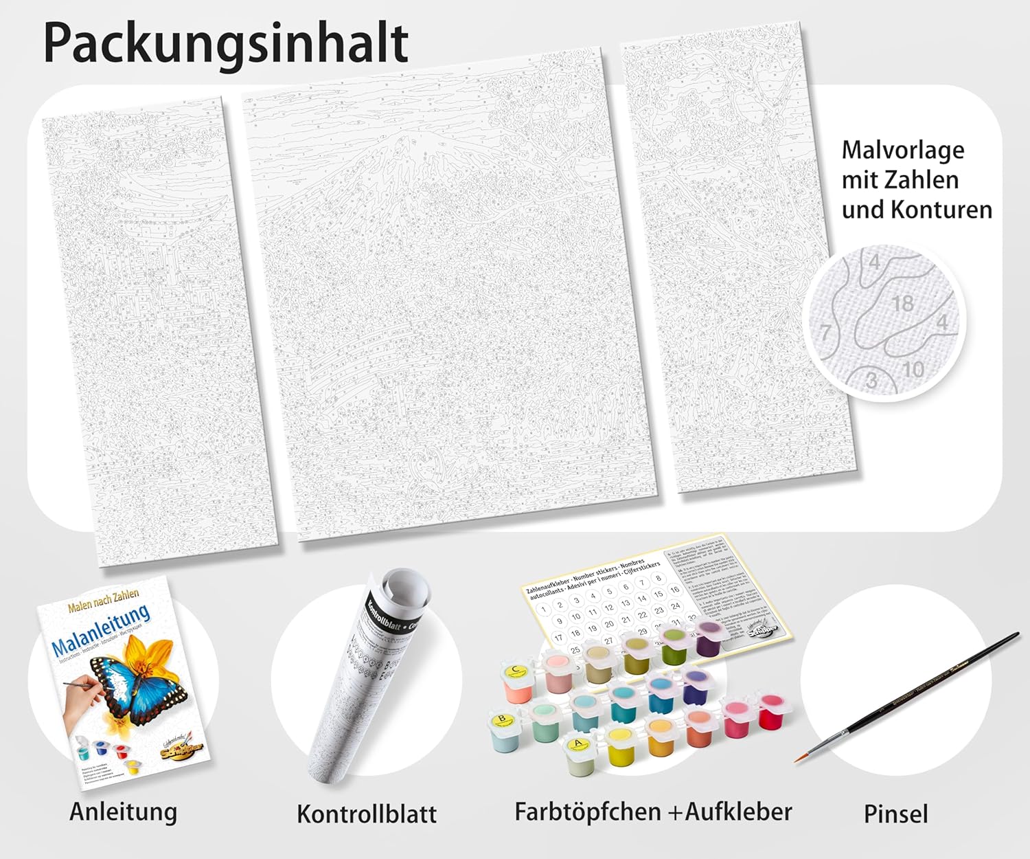• Vollständiges Set - Der Lieferumfang beinhaltet Acrylfarben auf Wasserbasis, einen Malpinsel, eine Anleitung, eine Vorlage und 3 Leinwände: 1 Mittelbild: 50 x 40 cm, 2 Seitenbilder: 50 x 20 cm