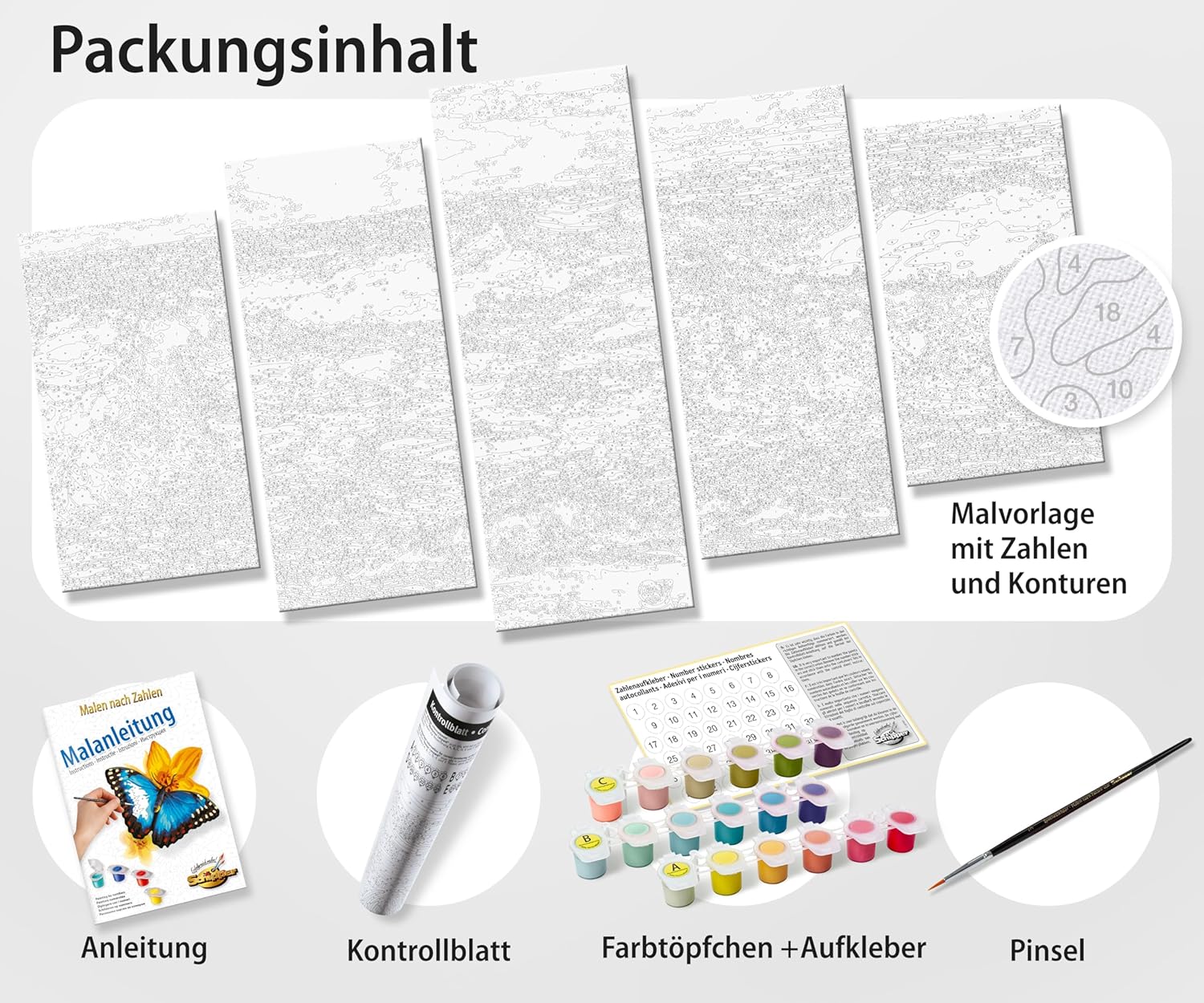 - Vollständiges Set - Zusätzlich zu den fünf Vorlagen umfasst das Malen nach Zahlen Set: hochwertige Acrylfarben auf Wasserbasis, einen feinen Malpinsel, ein Kontrollblatt und eine Malanleitung