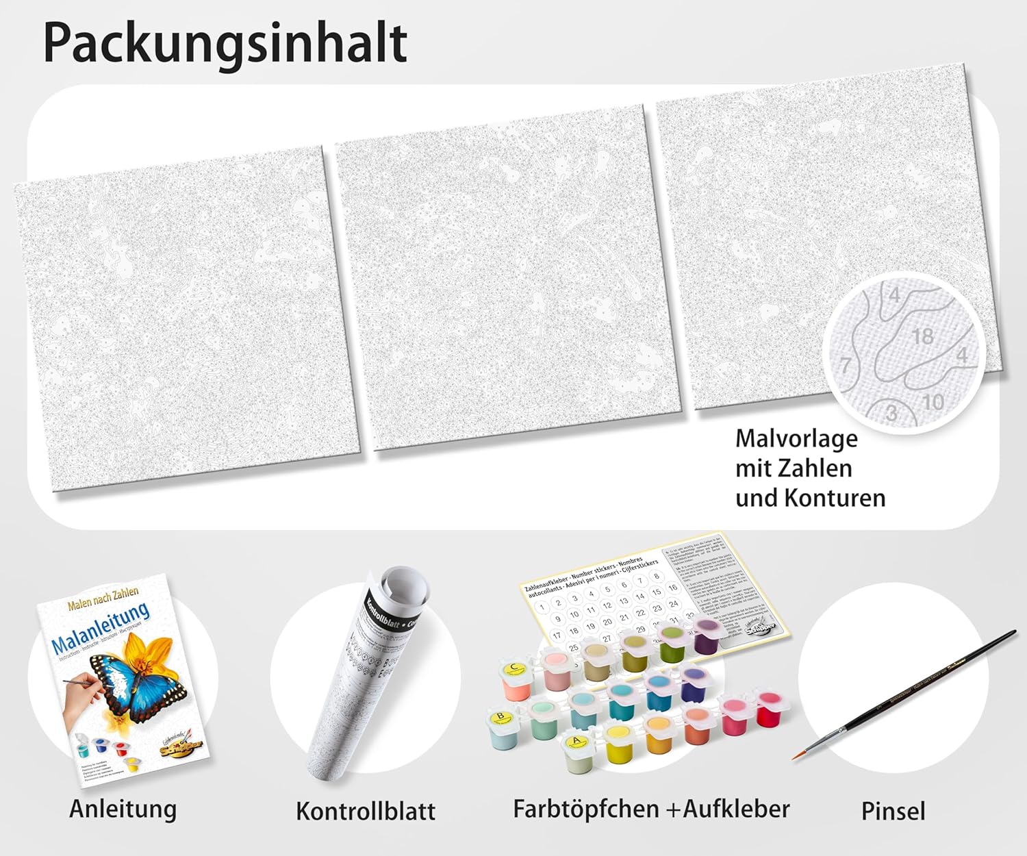 • Vollständiges Set - Der Lieferumfang beinhaltet Acrylfarben auf Wasserbasis einen Malpinsel eine Anleitung eine Vorlage und 3 Leinwände mit dem Mass je 40 x 40 cm