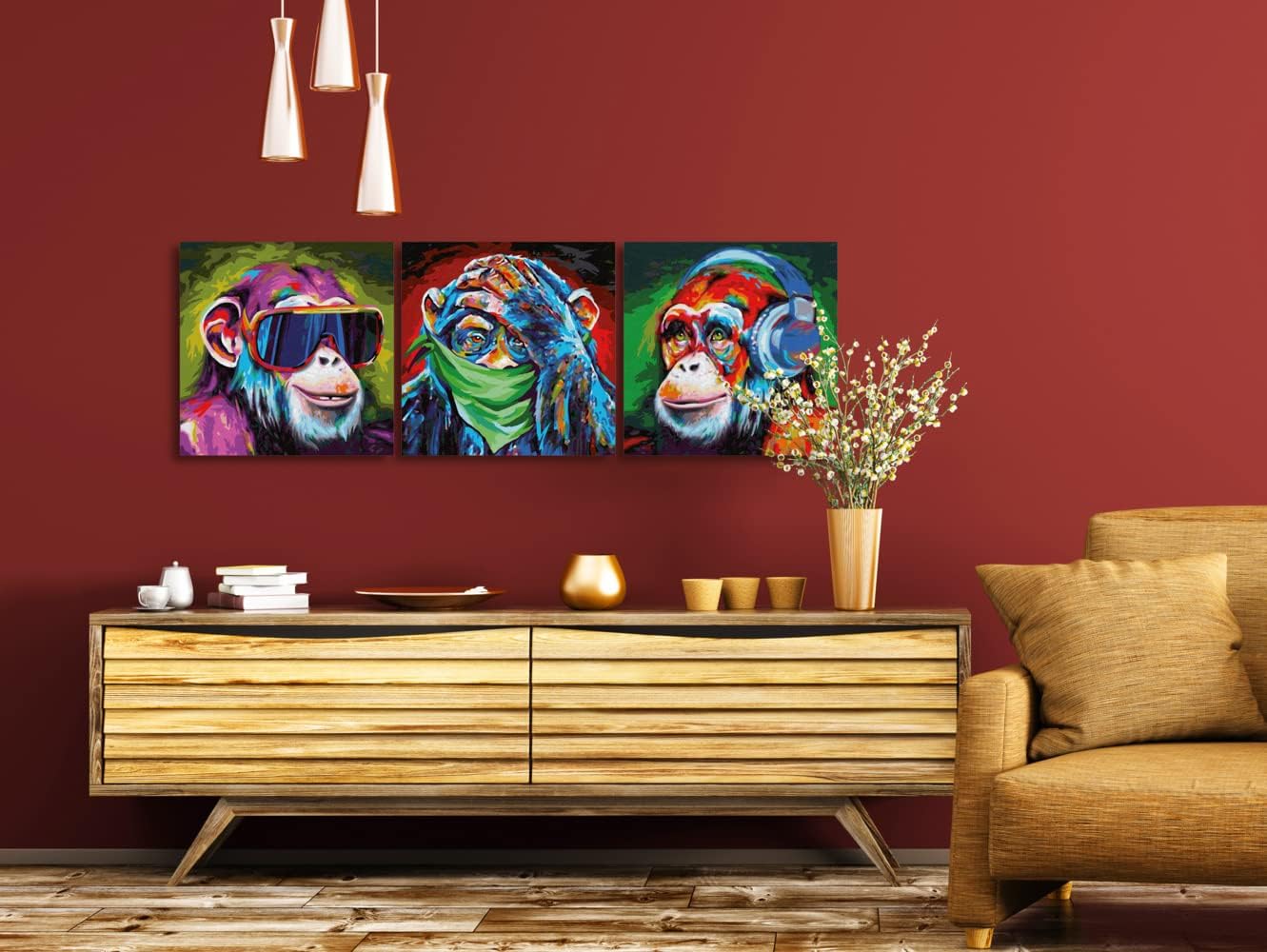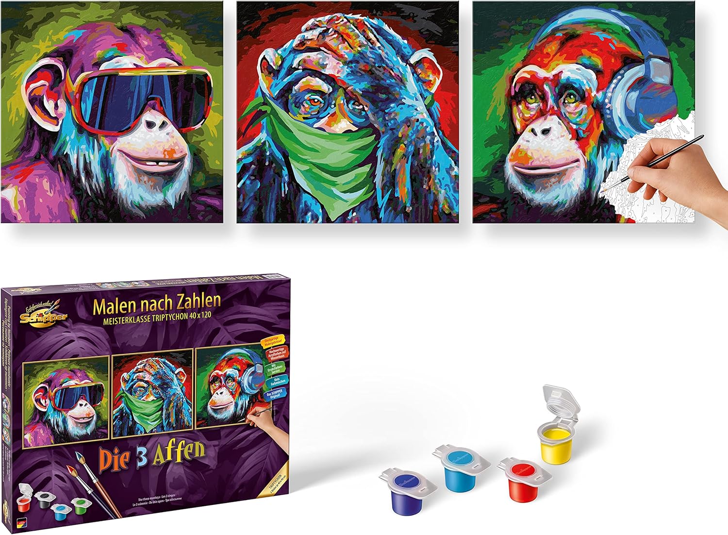 • Vollständiges Set - Der Lieferumfang beinhaltet Acrylfarben auf Wasserbasis einen Malpinsel eine Anleitung eine Vorlage und 3 Leinwände mit dem Mass je 40 x 40 cm