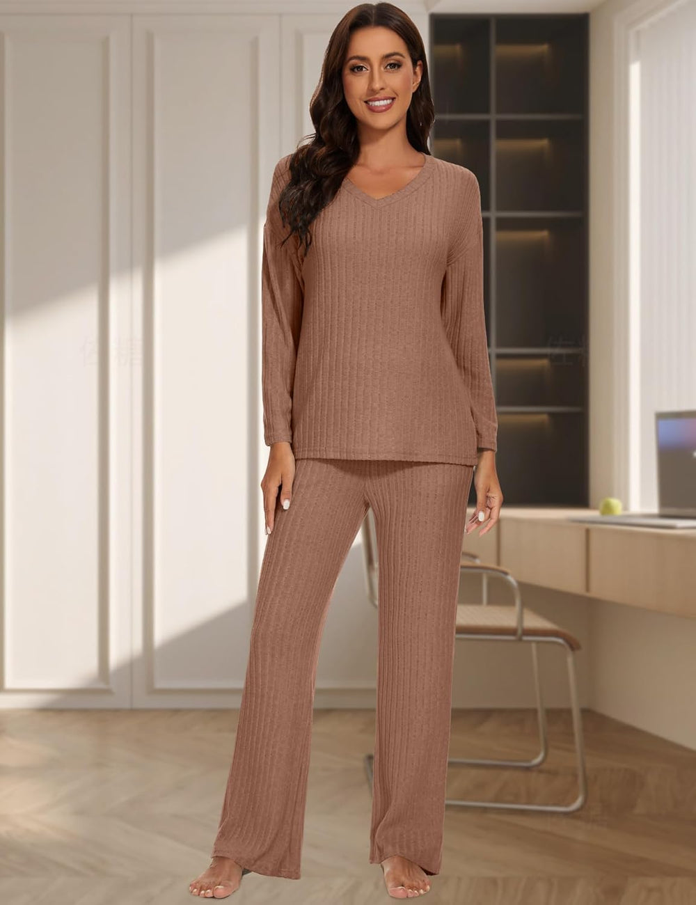 - ❤【Eigenschaften】: Der Oberteil Und Hose Set Damen verfügt über ein langärmliges Oberteil mit V-Ausschnitt, und einer Hose mit weitem Bein der hohen Taille. 2 Taschen, klassische volltonfarben, lässige, lockere Passform, dieses Heim-Outfit