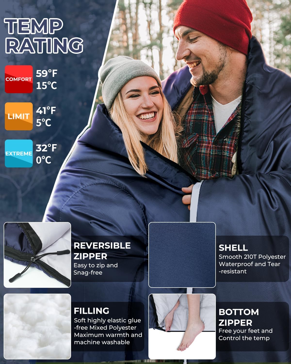 • 3 SAISONEN DOPPELSCHLAFSACK: Unser Schlafsack für 2 Personen ist das ultimative Must-have für Camping und Wandern, das die Bequemlichkeit für drei Jahreszeiten (Frühling, Sommer und Herbst) bietet. Mit einer Temperaturbewertung von 7°C-20°C können
