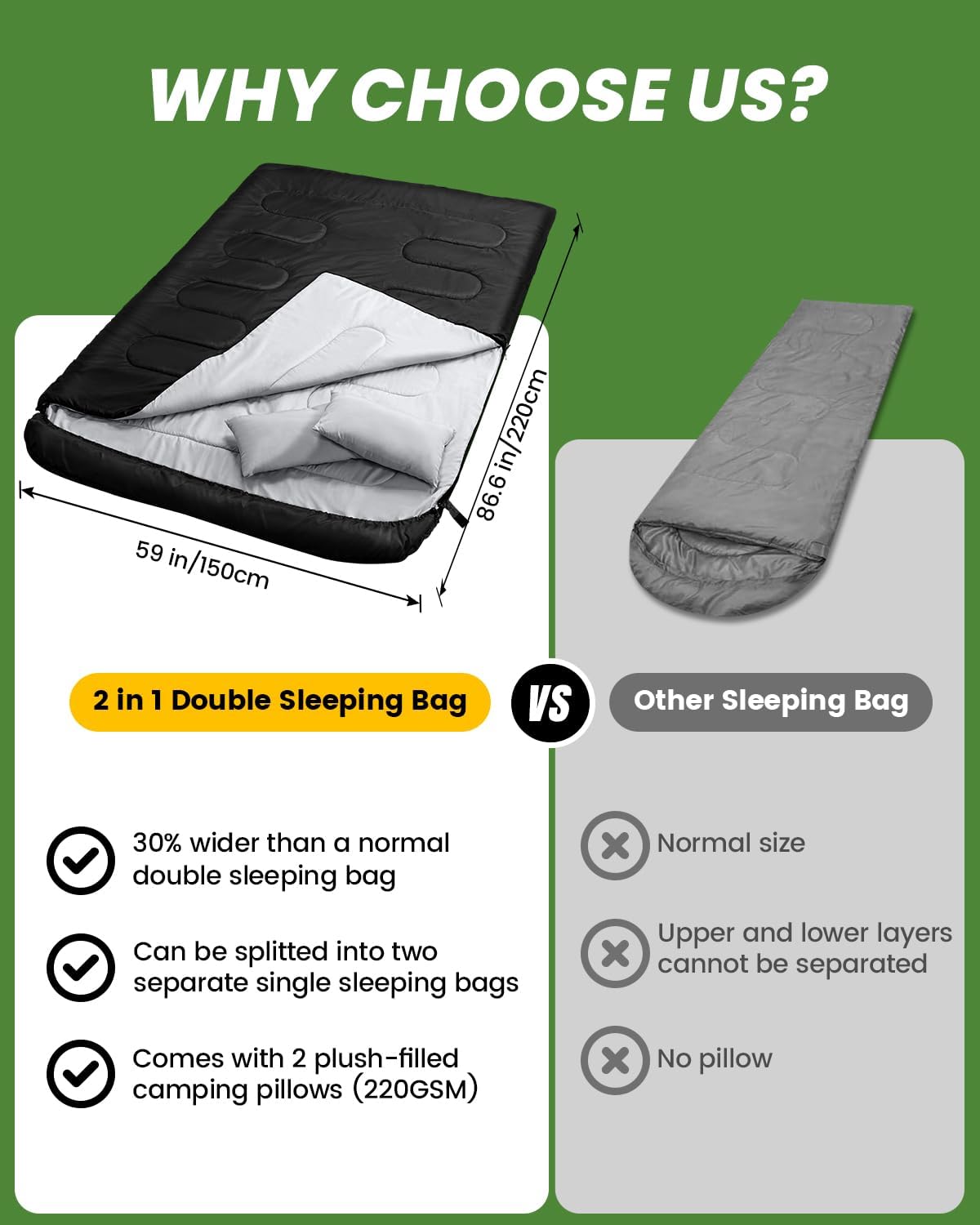 - Multifunktionaler Schlafsack: Unser Doppelschlafsack verfügt über ein Design mit umlaufendem Reissverschluss und zwei Kissen, so dass Sie den Schlafsack in zwei separate Schlafsäcke oder zwei Queen-Size-Decken aufteilen können. Egal ob drinnen oder
